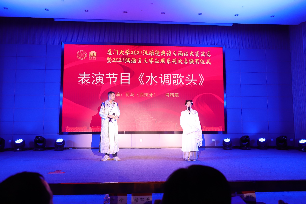 期间,我院身着汉服的2021级硕士研究生荷马(墨西哥籍)、肖婧宸为本次大赛带来了诗朗诵节目——《水调歌头》,他们用丰富的情感尽情演绎着皓月当空、美人千里的诗词氛围,赢得了在场观众的热烈掌声。
