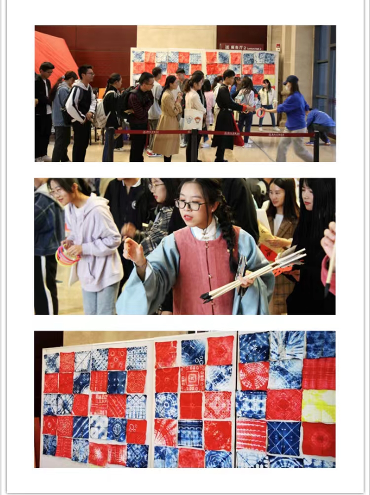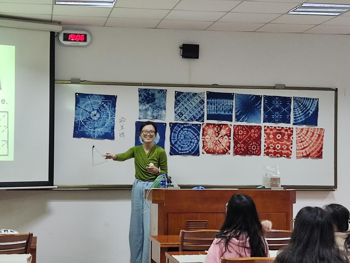首先,肖老师通过王孜学长为本次课程特意发来的家族扎染品牌宣传片作为课程的切入点,同时向大家展示了企业外宣材料,让大家了解到中国古代染采艺术的发展和传统扎染老字号的传承,以及当今为适应市场作出的革新。王孜学长在去年参加第八届“中国日”时看到同学们制作的扎染展示墙,感动于传统非物质文化遗产能够走进大学校园,而且广受大学生们的认识和喜爱,所以一直协助推进学院扎染研修活动。