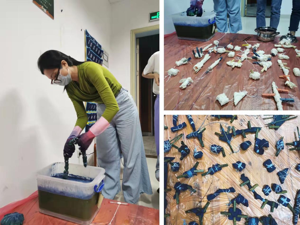 肖宁遥老师还向同学们讲述了扎染的历史,周朝与染色业有关的官职有7个,当时称为“染人”,可知染采自古就是社会生活的大事。《说文解字》中关于颜色的词就有绛、杂、墨、绿、红等等,肖老师还为同学们分发了针对本次扎染研修活动的研修单,供同学们学习中和学习后思考研究。