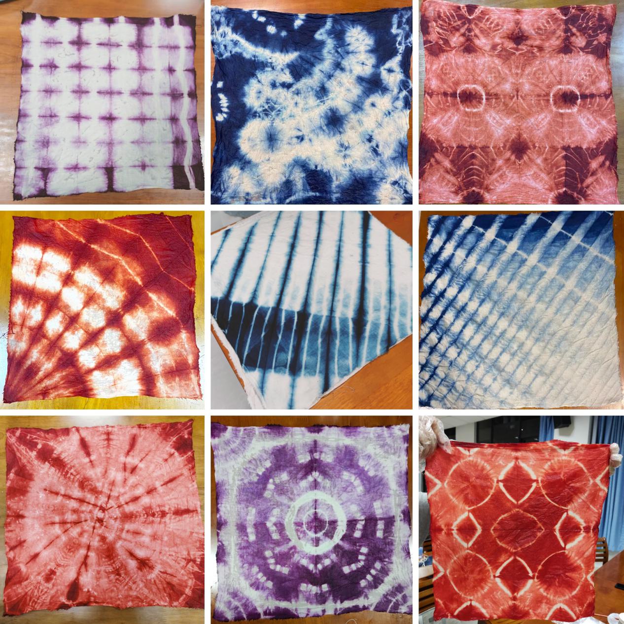 认真负责的黄老师自始至终都悉心指导、帮助同学们完成每一个扎染环节。期间,浸染时间加上晾干时间要超过一个小时,这时黄燕华老师主动提出延长自己的指导时间,她希望给大家带去一次完整的扎染研修体验。同学们听了都非常感动,大家一致决定延时,体验一次完整的扎染过程。最终,同学们都收获了自己风格各异的扎染作品,有的雅致、有的大气、有的抽象,每个人的脸上都洋溢着喜悦与笑容。