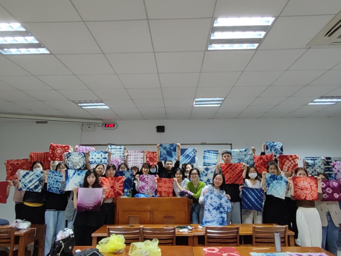 在活动最后,黄燕华老师、肖宁遥老师与同学们一起合影留念,此次扎染艺术研修活动圆满成功。同学们都成功学会了扎染工艺的基础技巧,并收获了自己独特的作品和美好的回忆。