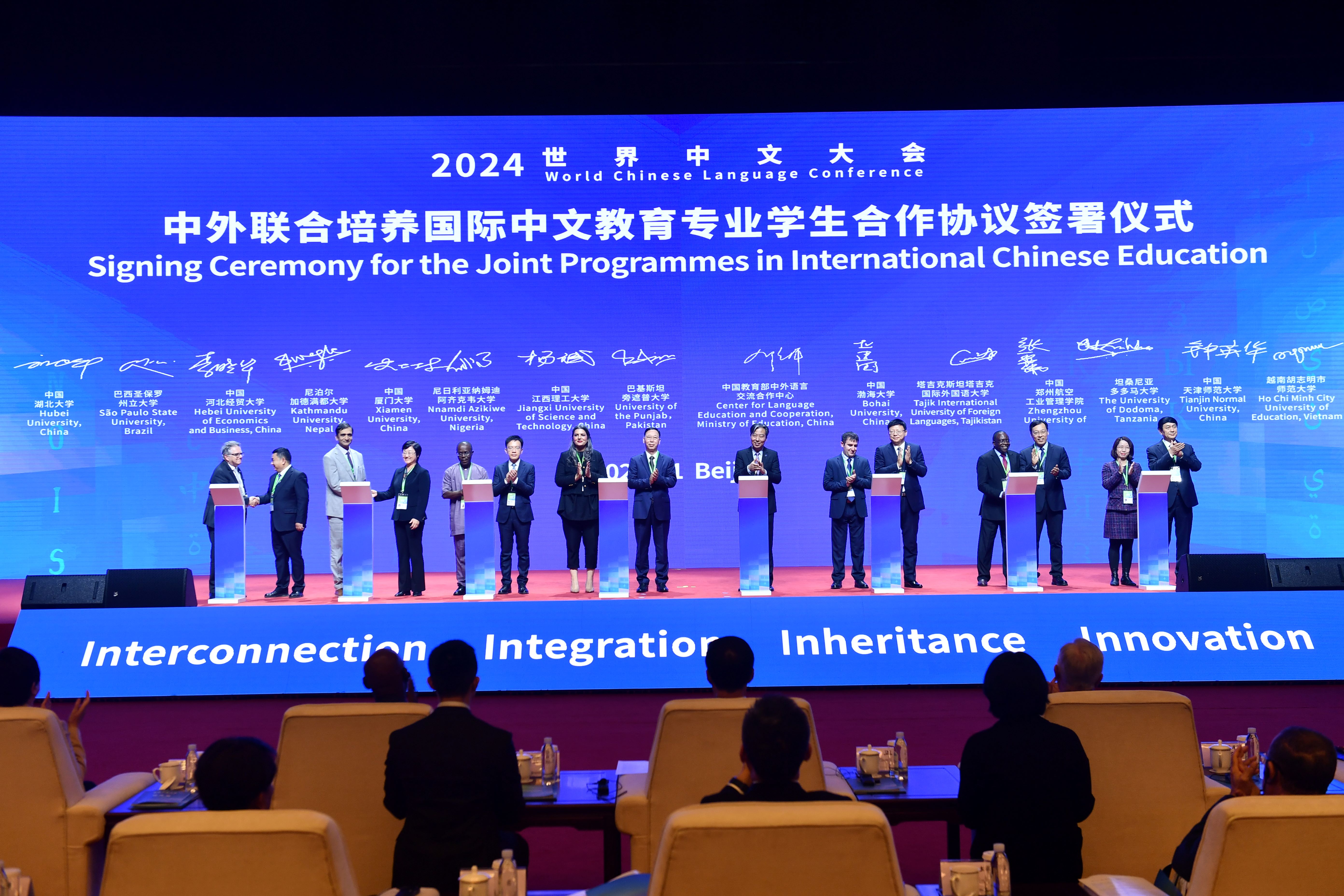 2024年世界中文大会以“联通融合,传承创新”为主题,由中华人民共和国教育部主办,中外语言交流合作中心、中国国际中文教育基金会和世界汉语教学学会共同承办。来自160多个国家和地区的教育主管部门、国际组织、中外高校及国际语言文化推广机构负责人、专家学者、企业代表、驻华使节等2000多人参加。