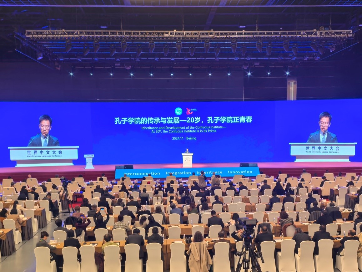 11月15—17日,2024世界中文大会在北京国家会议中心举行。国家主席习近平向2024世界中文大会致贺信并祝贺孔子学院成立20周年。国家副主席韩正出席大会开幕式,宣读习近平主席贺信并致辞。