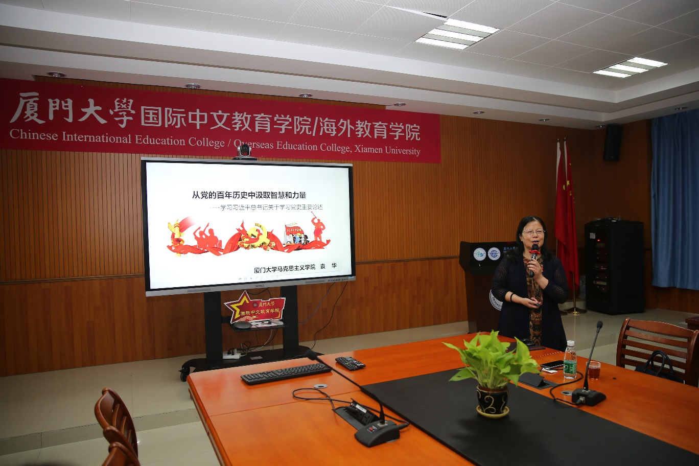 为更好贯彻落实习近平总书记在党史学习教育动员大会上的讲话精神,继续推进党史学习教育走向深入,11月1日下午,厦门大学国际中文教育学院/海外教育学院特别邀请了厦门大学马克思主义学院副教授、厦门城市党建学院特聘客座教授、厦门大学党史学习教育宣讲团成员袁华前来我院开讲。院党政班子成员、全体教职工和学生党员代表聆听了讲座。