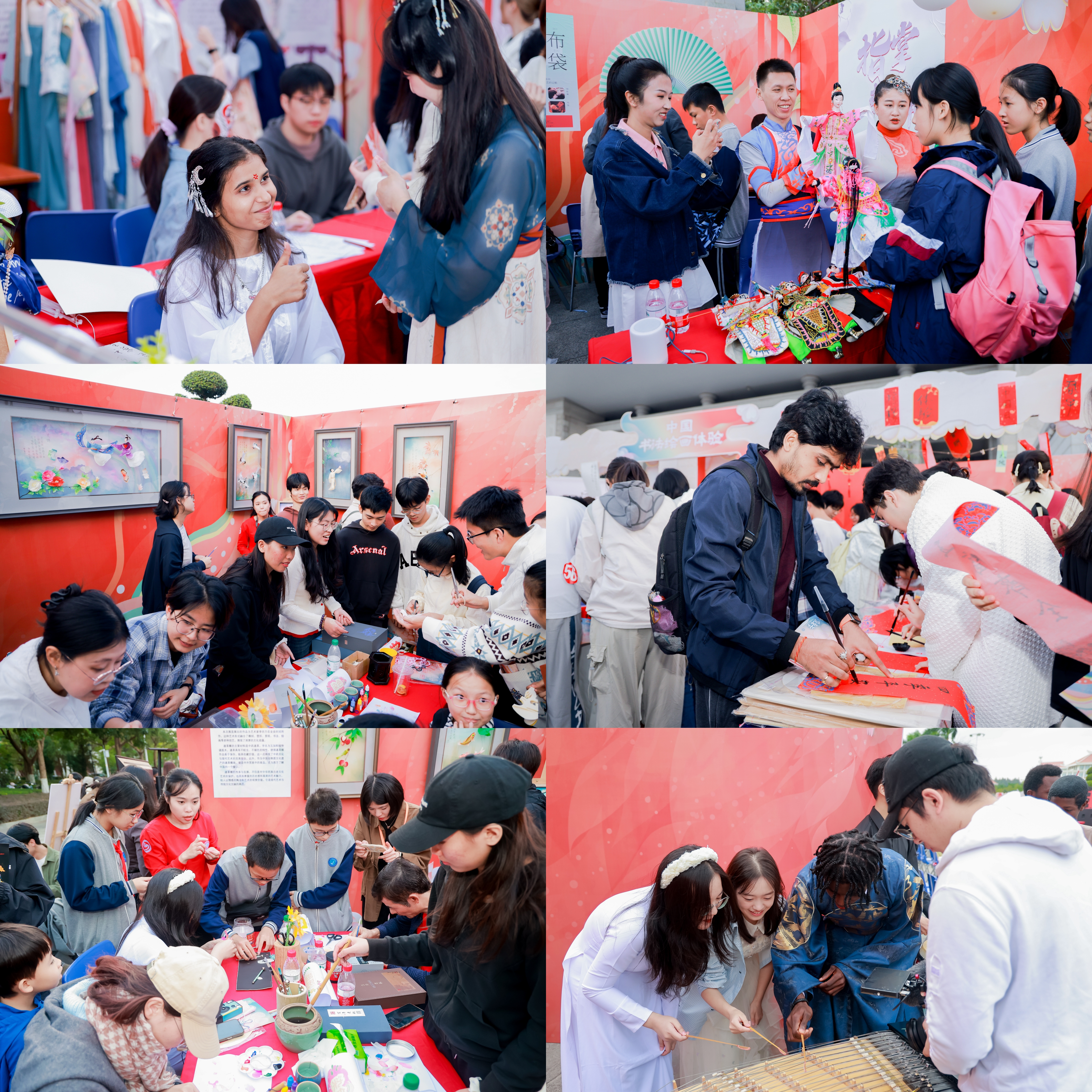 活动现场,十二项中国非物质文化遗产展示与体验项目令人目不暇接。参与者们进行了一系列丰富多彩的中华传统文化体验活动。其中,中国传统通草工艺作为一项鲜为人知的非物质文化遗产,以其精湛的技艺和独特的艺术价值,让参观者们惊叹不已。中国传统纸艺体验区与时尚结合,一场别出心裁的剪纸服饰秀惊艳亮相,设计师们巧妙地将剪纸艺术与婚纱、油纸伞等元素相结合,展现出了传统与现代的完美融合。而作为世界级非物质文化遗产、国家双非遗的布袋木偶也备受瞩目。中国结展位也人山人海,在展位筹备阶段就聚满了迫不及待体验的同学们;体验投壶、七巧板、鲁班锁等传统游戏带来文化乐趣;汉服、旗袍体验感受传统服饰美丽优雅,更有戏曲勾脸老师现场为大家上妆;面塑制作更是与流行相融合,让人叹为观止!传统书法绘画集聚了大家火一般的热情,民族乐器体验让大家近距离感受中国音乐美丽。闽南传统舞龙舞狮体验、宋江阵体验阵势宏大,技艺非凡,让所有来宾深深震撼!