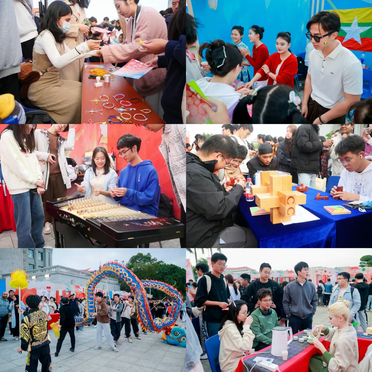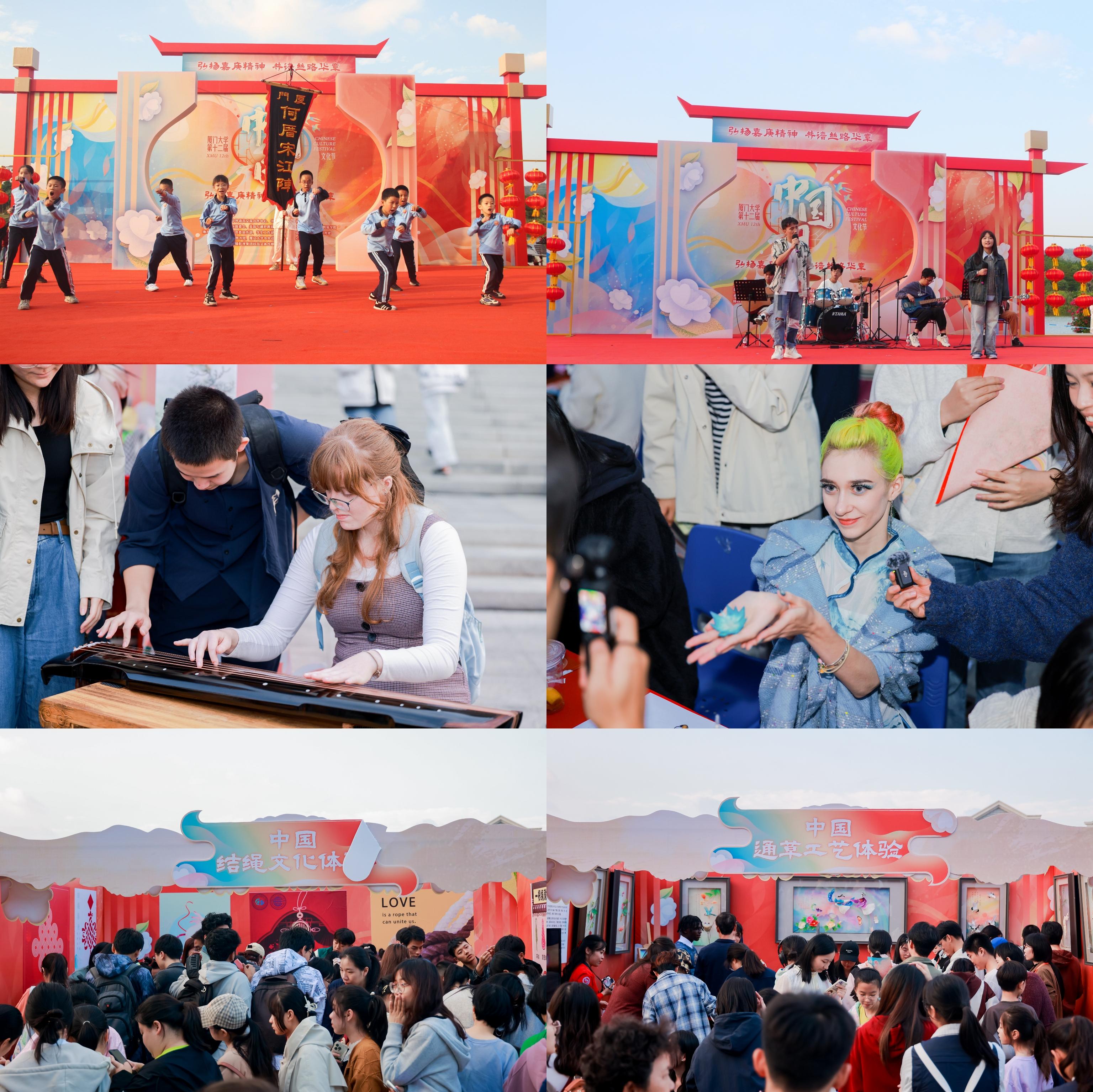 本届文化节还为大家带来了别具一格的文化体验。在闽南传统文化宋江阵精彩展示之后,柏橙乐队在舞台上倾情演唱互动,拉开了文化互动体验的序幕。三千余名中外师生齐聚在这场文化盛宴中。品茗、投壶、面塑、木偶戏等一系列精彩绝伦的文化体验活动不仅让海内外师生感受到中华文化的丰富多彩,也为他们提供了一个交流与互动的平台。不同国家和地区的师生们在这里分享着自己的文化感受,增进了彼此之间的了解和友谊。
