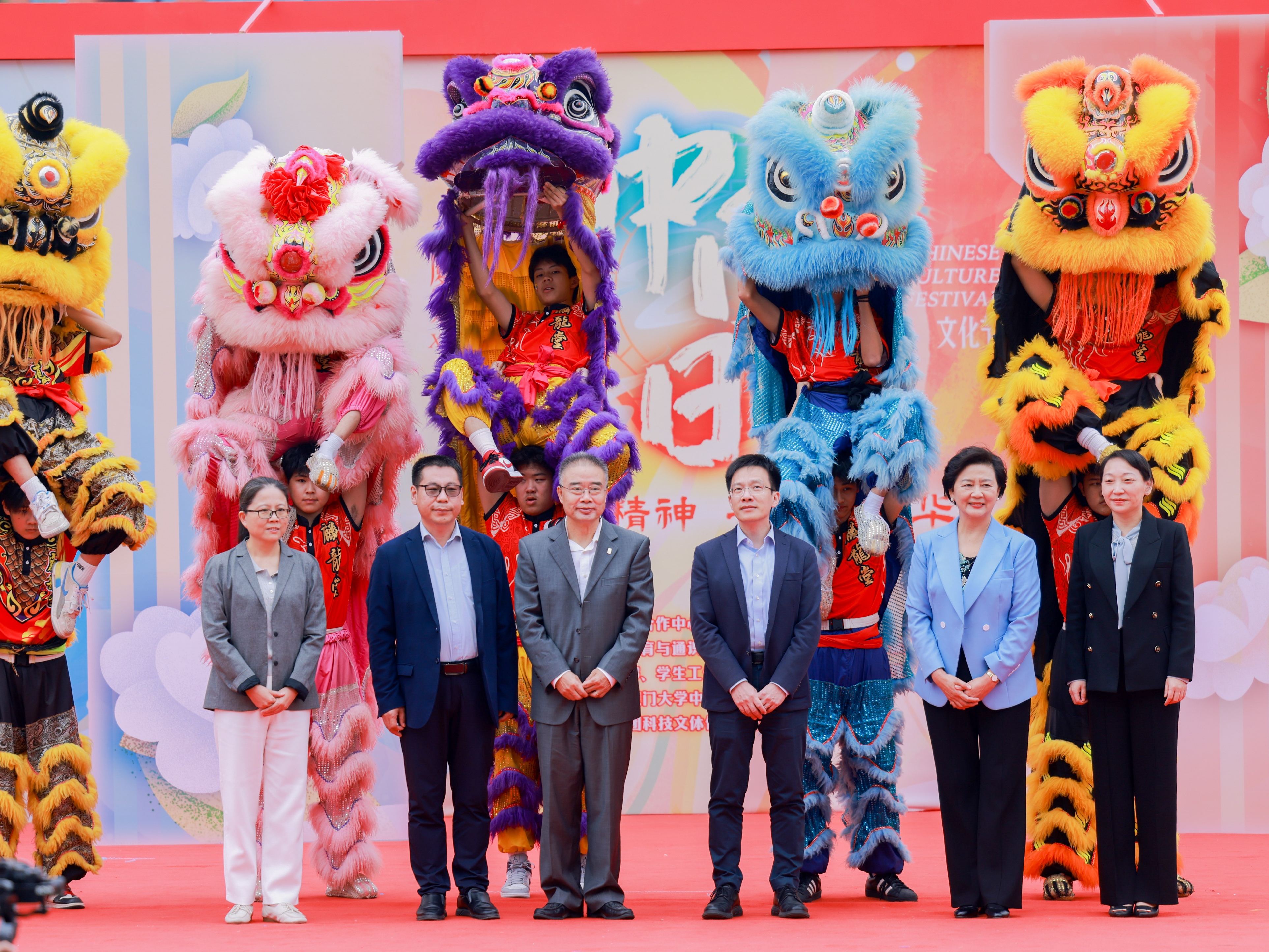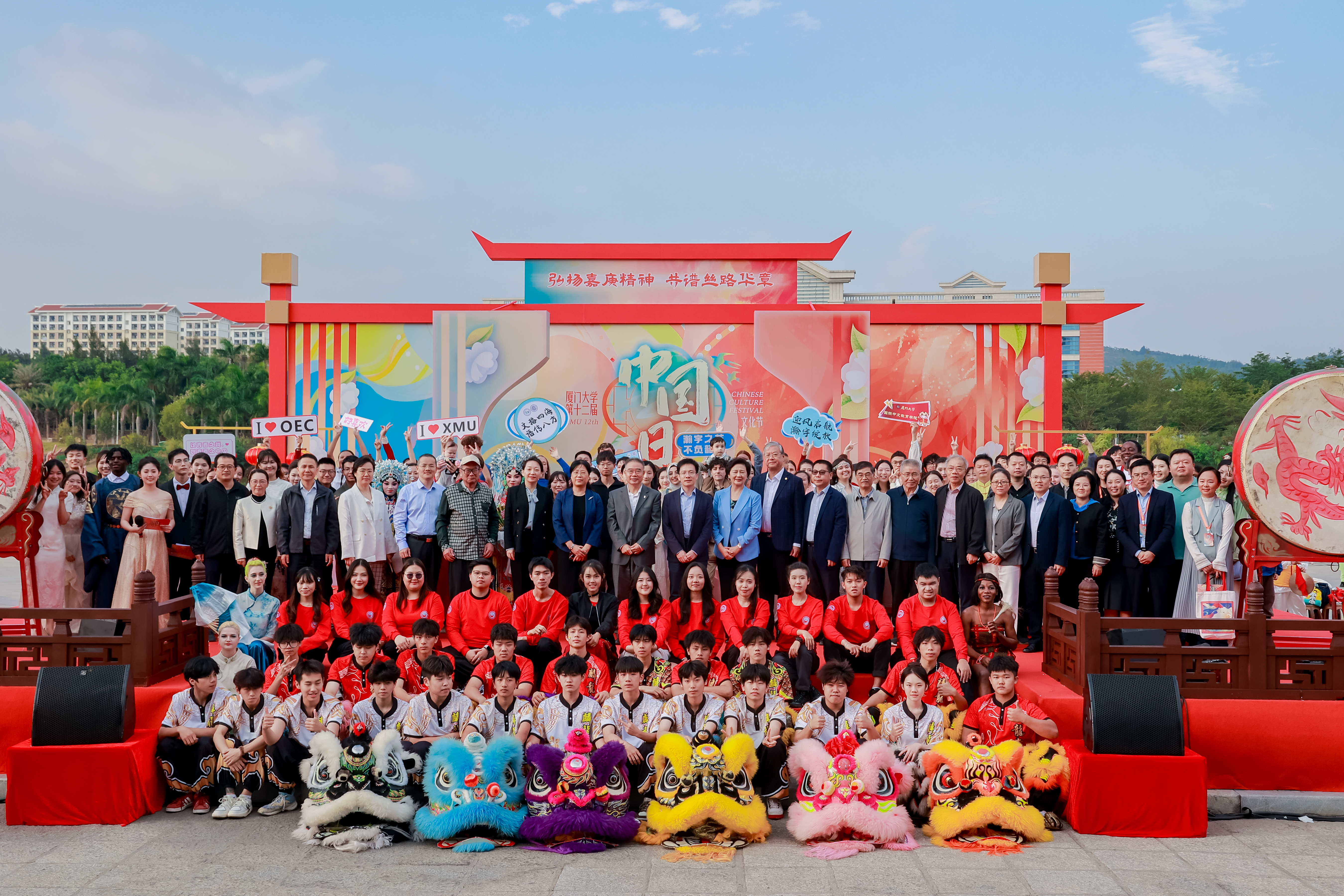 厦门大学翔安校区管委会副主任刘俊杰在致辞中表示,“中国日”文化节是厦大国际化办学的品牌活动,是深化文明交流互鉴,推动中华文化更好走向世界的重要举措。“中国日”文化节历经十二年,内容不断丰富,形式不断创新,很好地加强了中外学生之间的交流互鉴、文化互动,进一步弘扬了中华优秀传统文化,讲好中国故事,传播好中国声音。随后,领导嘉宾上台为本次活动启动舞狮点睛仪式,厦门大学第十二届“中国日”文化节正式启动。
