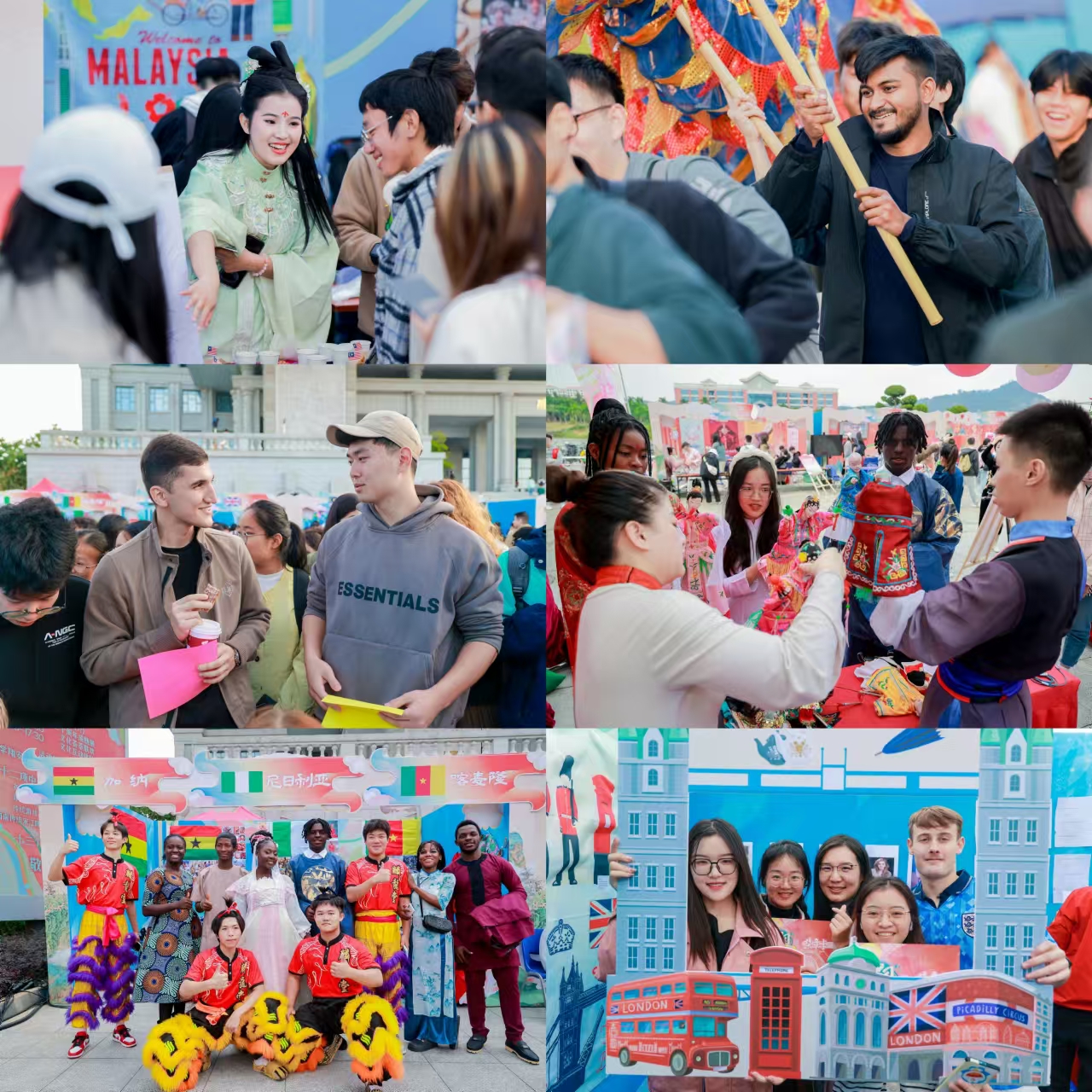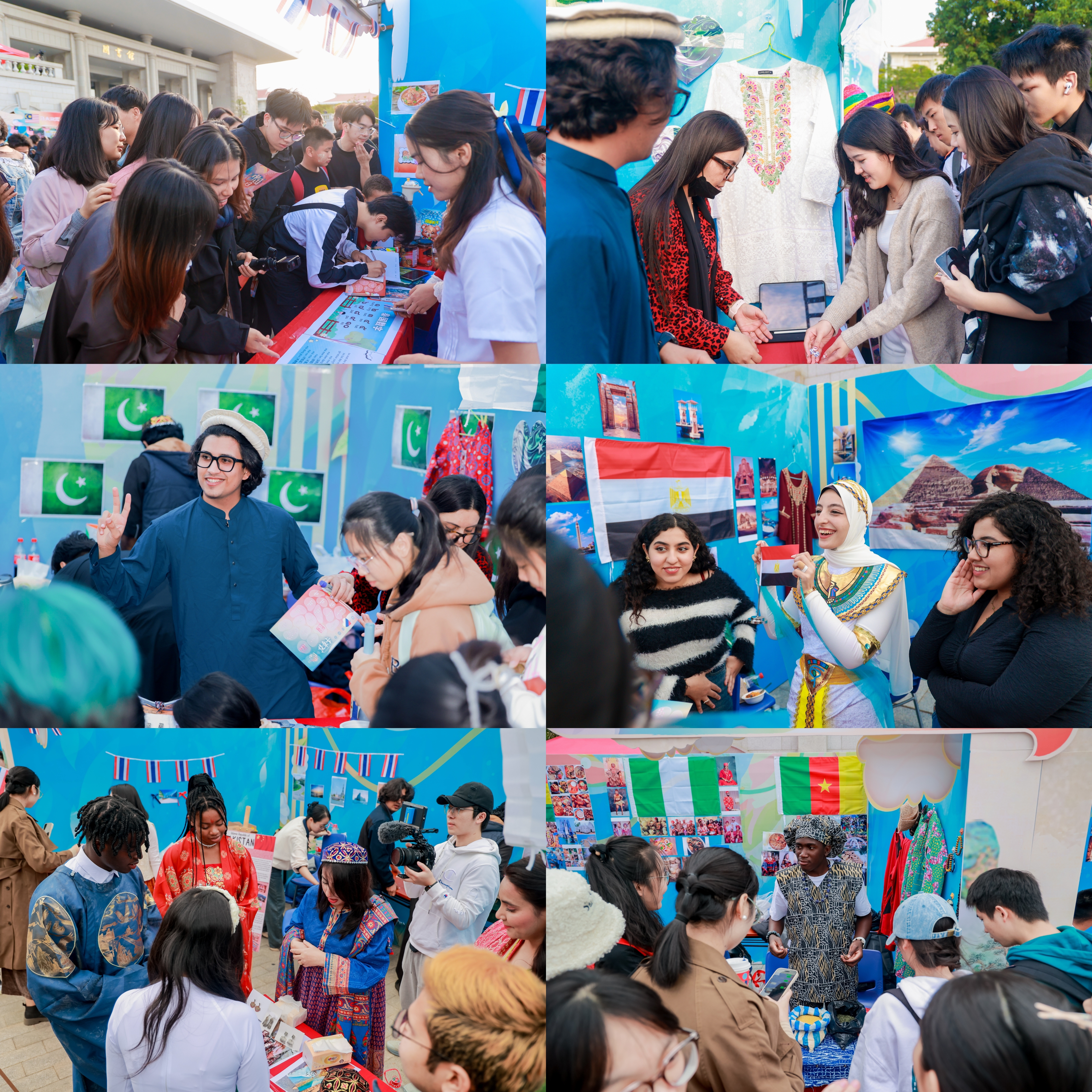 巴基斯坦展区以海娜手绘、传统风景明信片、“五石子”小游戏等引来众人排队体验;马来西亚扎染(bantik)、马来西亚当地与福建“闽南语”的异同、泰语名字书写体验、斯里兰卡“纱丽”换装、锡兰红茶品尝、俄罗斯套娃大赛、缅甸剪刀石头布游戏、非洲歌舞大联欢等等丰富多彩的活动,吸引着中外学生们积极参与,现场欢声笑语,热闹非凡。
