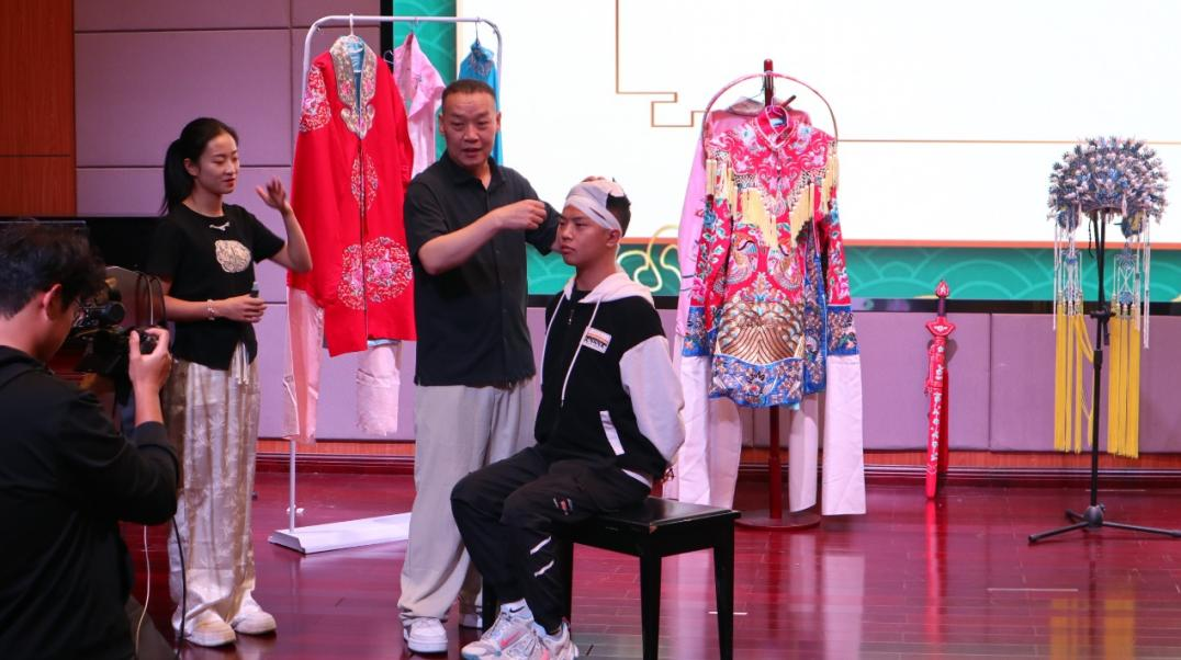 王永斌介绍了戏曲化妆的步骤,并邀请两位同学亲自体验戏曲化妆的第一步——勒头带。勒上三圈头带后,两位同学都感觉到了头部的不适,而一个完整的戏曲妆容需要勒十圈以上的头带,有时需戴上十多斤的头饰。从戏曲化妆这一个侧面,让在场师生感受到了戏曲演员的不易。