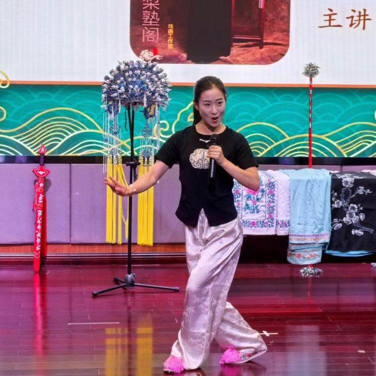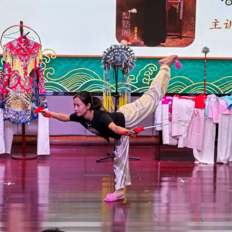 介绍完理论知识,王永斌邀请了国际学生娜娜亲自体验戏曲化妆。等待妆容完成的同时,刘瑞霞带来了一段京剧唱腔和来自家乡的保定小调。刘瑞霞一开嗓就给在场的所有同学带来了震撼,此刻,同学们或许更加体会到了王永斌此前所说:“戏曲是综合艺术,年轻人一定要去看戏曲,去看好的戏曲,无论什么戏种,现场更能感受到戏曲的魅力。”随后,刘瑞霞还表演了剧目《宝莲灯》中的一段舞剑,现场掌声雷动,久久不绝。