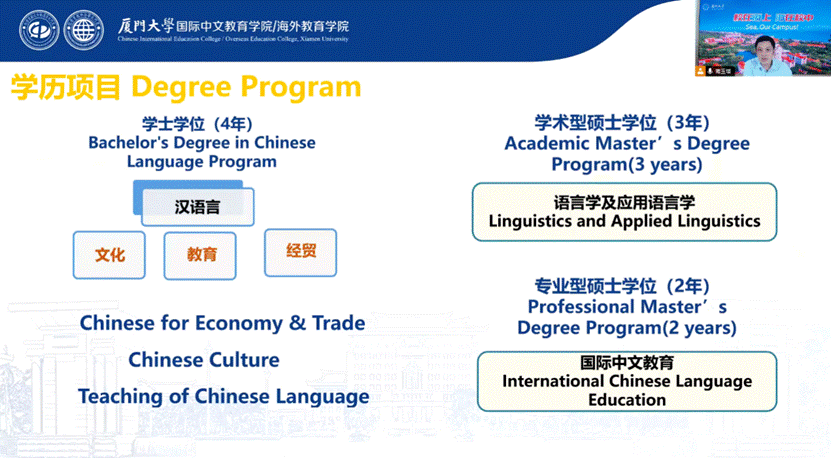 洪镔从一城、一人、一校引入,用丰富的照片视频展示了厦门大学的好看、好玩、好吃等,告诉大家为什么选厦门大学。随后他重点介绍了我们的汉语言本科项目,从培养方案、课程体系到师资配置,以及实习就业渠道拓展等方面的情况,并详细介绍了整体申请流程。