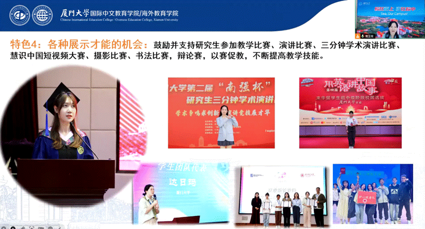 潘超青从历史传承、学科优势、国际合作、奖学金资源等多个方面,深入剖析了厦门大学的综合优势,并归纳出选择厦大的几大关键因素,还特别隆重介绍了我院今年新推出的奖学金项目。同时,她针对学院发展历程进行了系统梳理,详细阐述了学院在学科专业布局上的优化措施、文化活动特色及多样化的招生项目。这些项目覆盖了从短期语言进修到长期学历深造的各个层次,既有通用的课程体系,也有特色定制的项目,为学生勾勒出一条清晰的成长与发展路径。