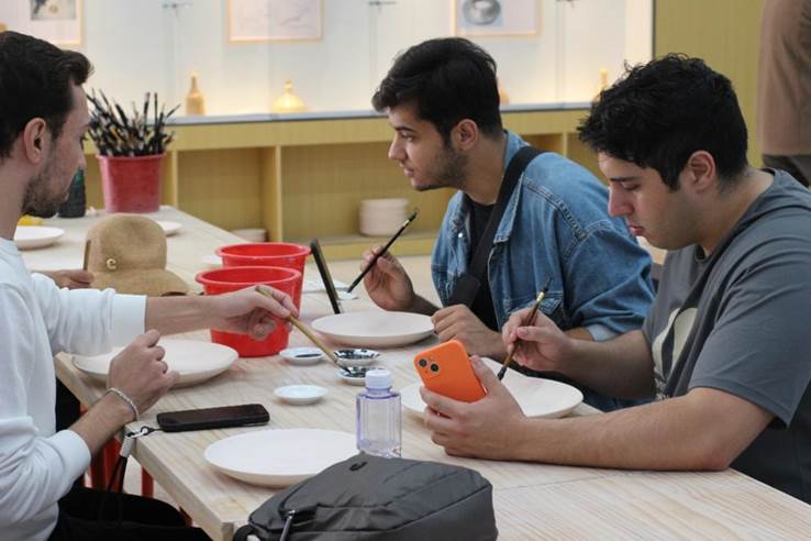 在德化一中,大家亲身体验陶瓷拉坯与瓷上作画。陶瓷拉坯是整个陶瓷制作工艺的核心内容,直接决定陶瓷烧造的质量。在老师的指导下,大家拿起陶泥,在转机上体验这门古老技艺。找中点、推塑、拉伸……一团团泥土在师生的手中焕发生机,衍生出无限种可能。瓷上作画需以瓷为纸,用毛笔蘸墨水在瓷上勾勒图画,画出的图画也称为瓷板画。同学们以笔为器,以瓷为媒,将心中愿景绘于瓷上,尽抒心中所想。