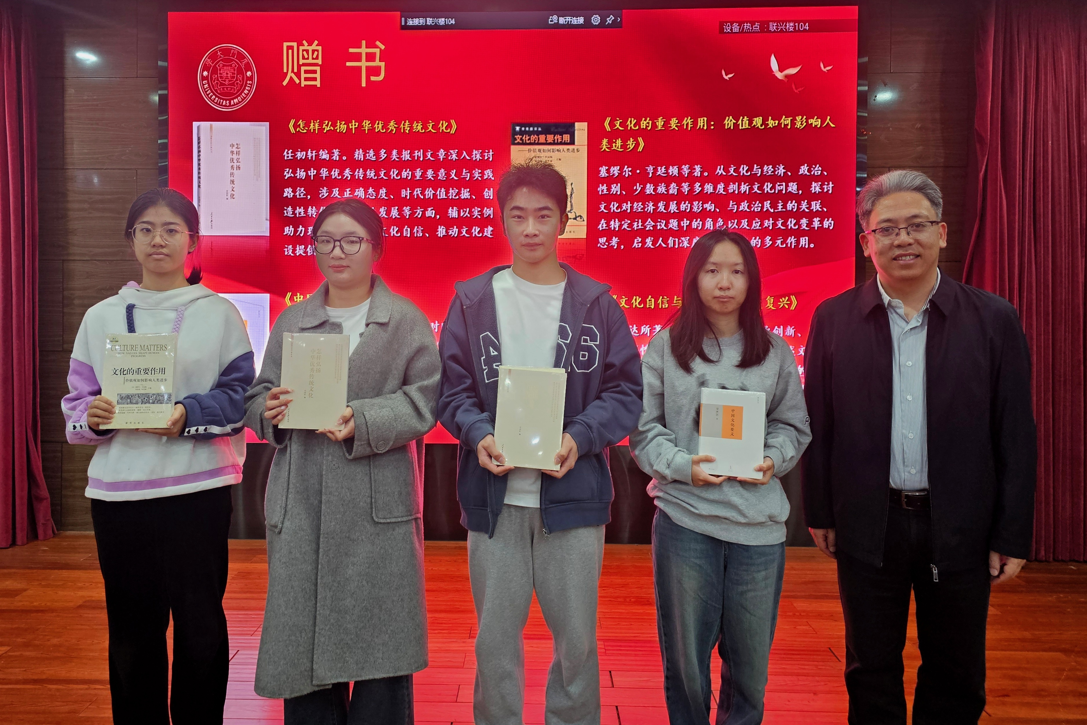 赠书仪式环节,黄辉向各小组代表赠送了多本与文化主题密切相关的书籍。这些书籍涵盖了中国文化要义、文化的重要作用、怎样弘扬中华优秀传统文化等多个方面的内容。