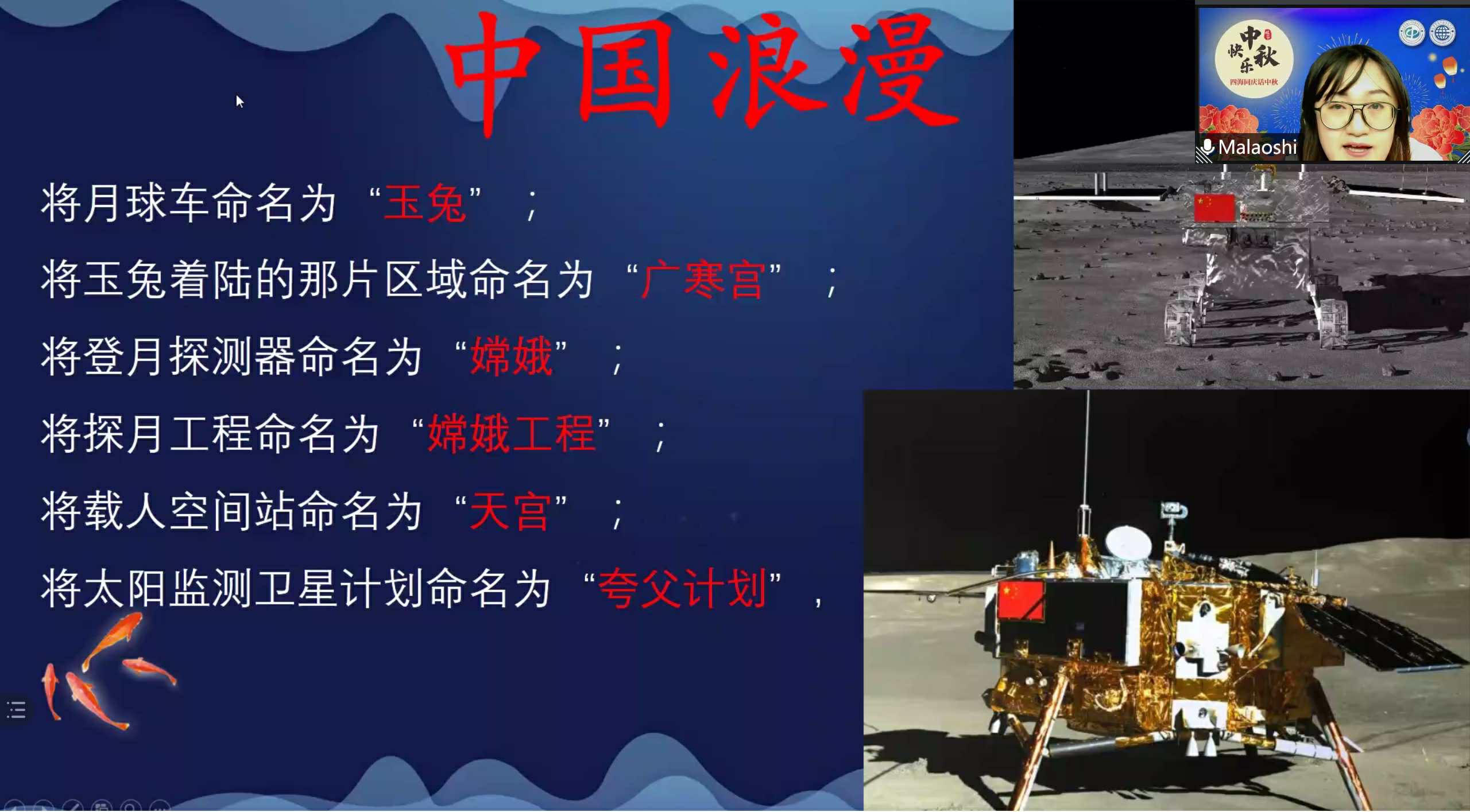 接着,马老师又向大家问道:你是否知道传统中秋节与现代太空梦有何渊源?嫦娥1号、嫦娥2号、玉兔1号、玉兔2号、神舟12号......你是否能读懂中国航天人特有的浪漫?自古以来,嫦娥奔月的神话家喻户晓,而到如今,万户飞天的尝试,中国人凭借着自己的努力,筑梦天宫,谱写出了中国载人航天事业热血又浪漫的故事。传统文化中的月,远在云上,寄托着中国人的瑰丽想象;而现今科技下的月,近在眼前,充盈着中国人的无穷智慧。
