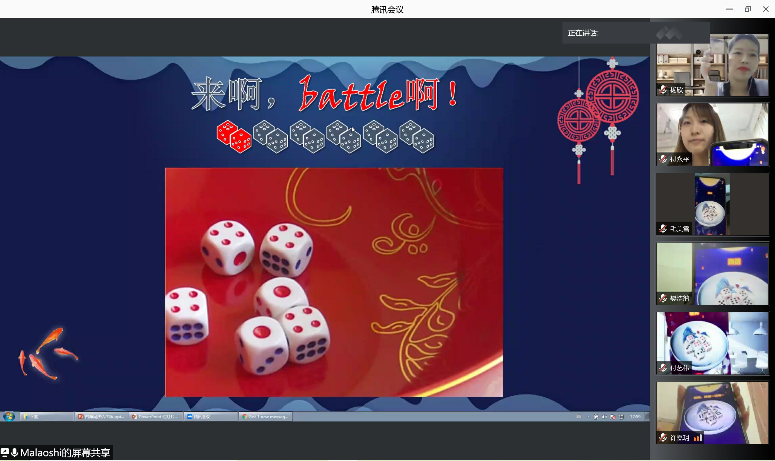为了让同学们即使在线上也能感受到节庆的欢快氛围,马老师别出心裁地设计了“在线battle闽南博饼”趣味游戏环节,简单介绍了博饼起源及运用微信小程序博饼规则,邀请在座师生在线斗阵博饼。活动“现场”热闹非凡,同学们都十分积极地投入到博饼游戏中,玩得不亦乐乎。