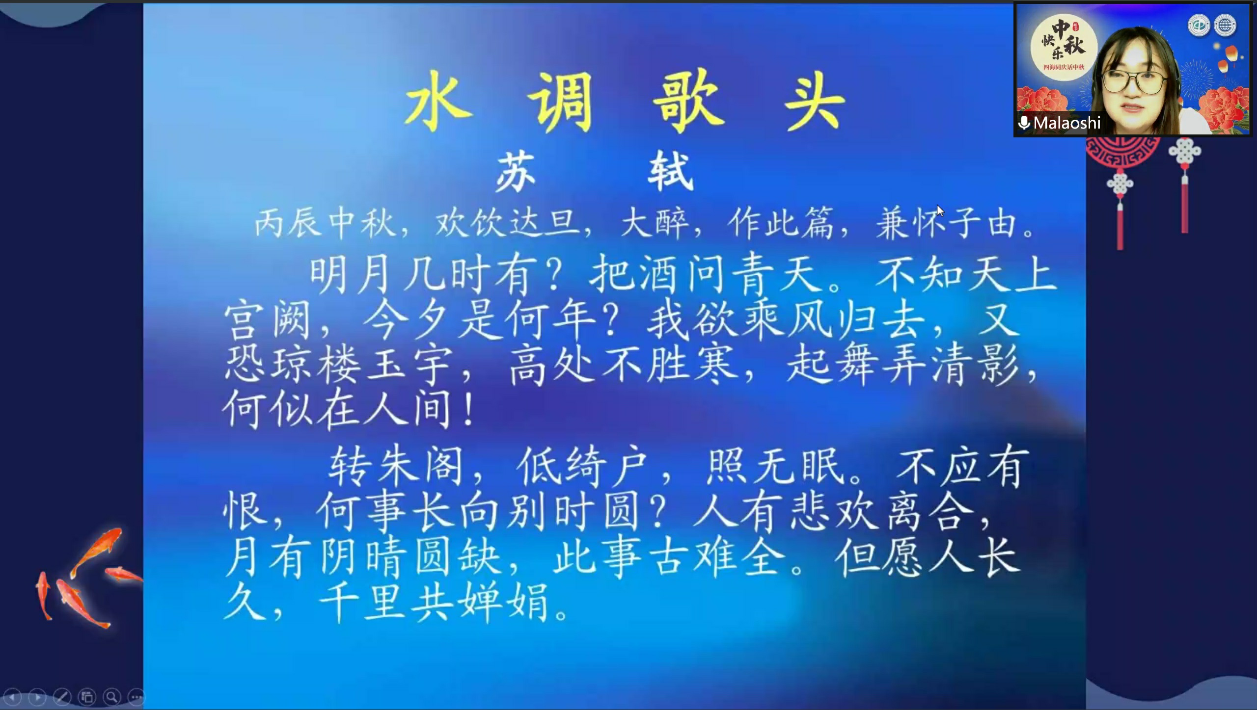 “人生代代无穷已,江月年年望相似”,从古至今,月亮都寄托着中国人的满腔情思,在轻柔的乐声中,马老师与在座师生分享了许多与“明月”相关的诗词名篇,大家的思乡心绪也被勾起。