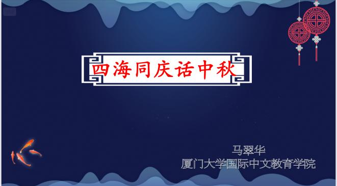 银汉迢迢,纤云弄巧。响应疫情防控下的就地过节号召,9月20日,厦门大学国际中文教育学院/海外教育学院在线上开展了一场别开生面的“四海同庆话中秋”主题活动。活动由学院党委副书记吴荻主持,特邀马翠华老师担任主讲嘉宾,学院党委书记范丽、团委书记陈艺新、学院辅导员林炯、关丽文莅临活动,还有近百名师生共同参加了本次线上活动。