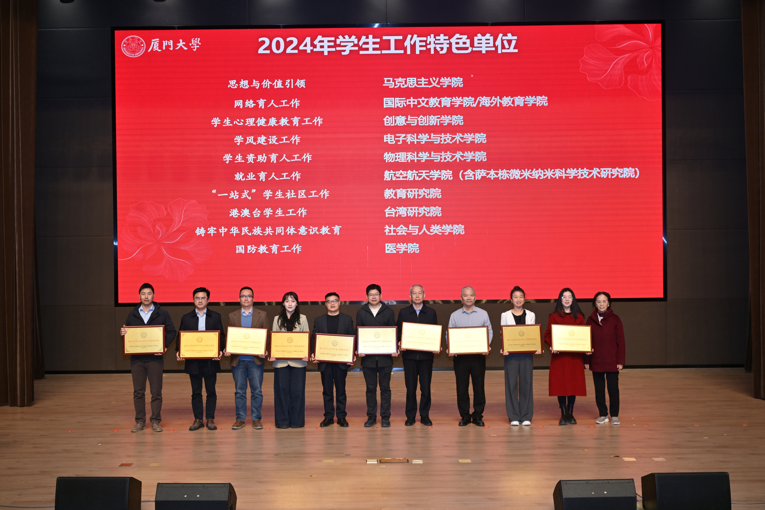 1月11日,厦门大学2024年学生工作总结研讨会在翔安校区举行。大会总结学校2024年学生工作的成绩和亮点,分享重点及专项工作经验做法,并对2024年学生工作先进单位、特色单位和优秀辅导员进行表彰。国际中文教育学院/海外教育学院荣获“网络育人工作”和“国际学生工作”两项“学生工作特色单位”,两位学生兼职辅导员考核“优秀”。