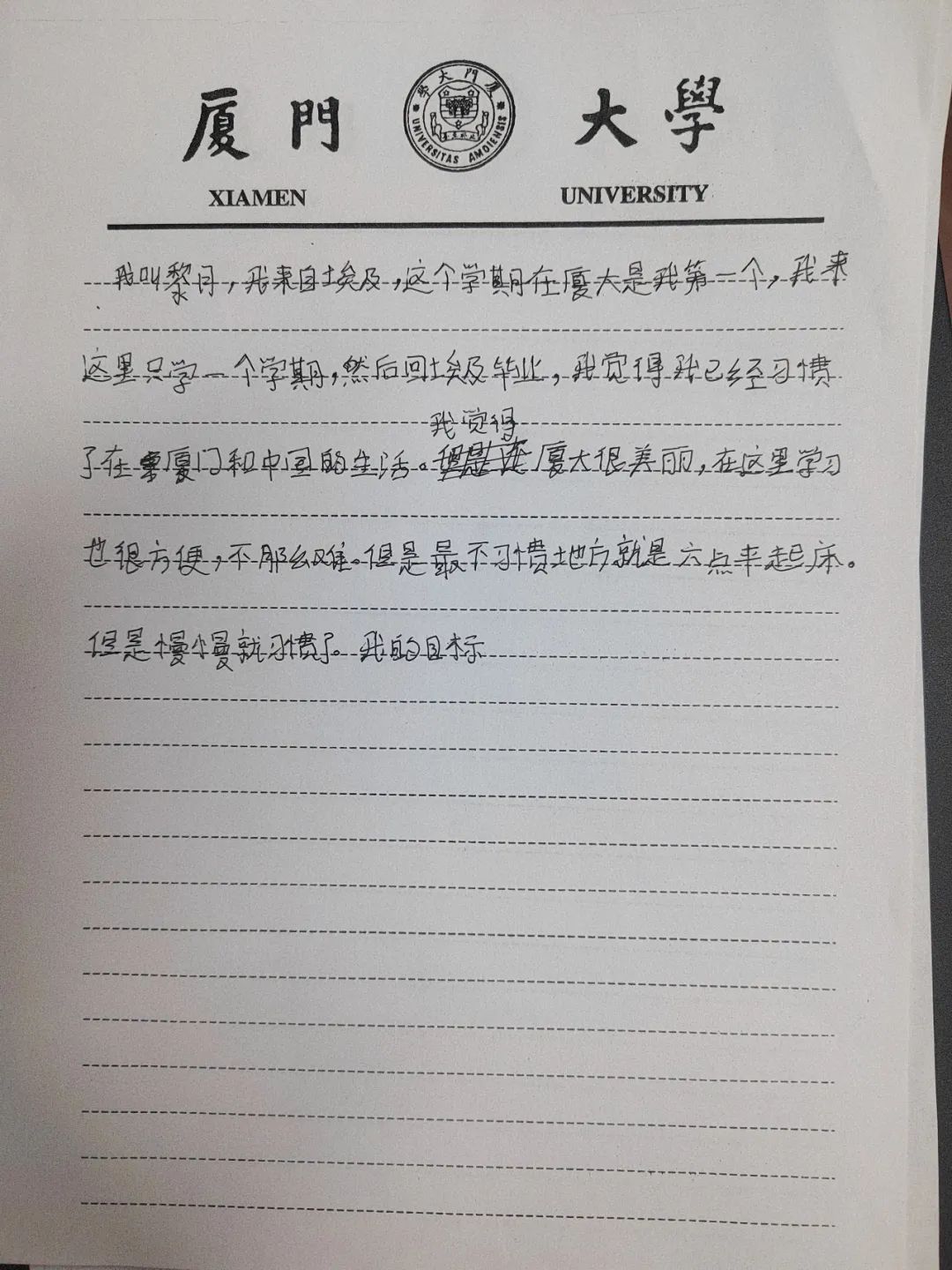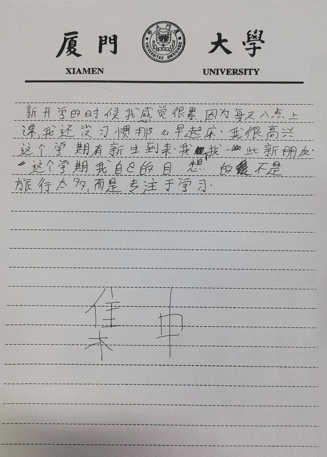 来自德国的留学生何凯丽写下“集中”一词。她坦言刚开学还不太适应早起,不过结识许多新朋友让她十分开心。她表示这学期想专注于学习,减少外出旅行。来自埃及的留学生黎月表示,能来厦门大学学习很开心,学校很美丽,她期望这学期可以提升中文水平,同时前往成都等地旅游。