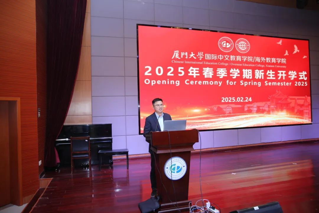 灵蛇献瑞,万象启新。2月24日下午,厦门大学国际中文教育学院/海外教育学院2025年春季学期国际新生开学式在坤銮楼B102顺利举行。厦门市公安局出入境管理局五大队副大队长白慧源,警官刘步云;学院党委书记许美霞,院长陈志伟,副院长耿虎、潘超青,党委副书记林明华,华文系主任朱宇,华文系副主任孟繁杰、郭建花,部分教师代表、辅导员、党政管理人员与全体2025级春季国际新生参加仪式。开学式由林明华主持。