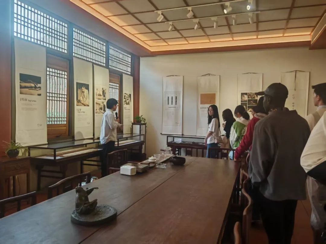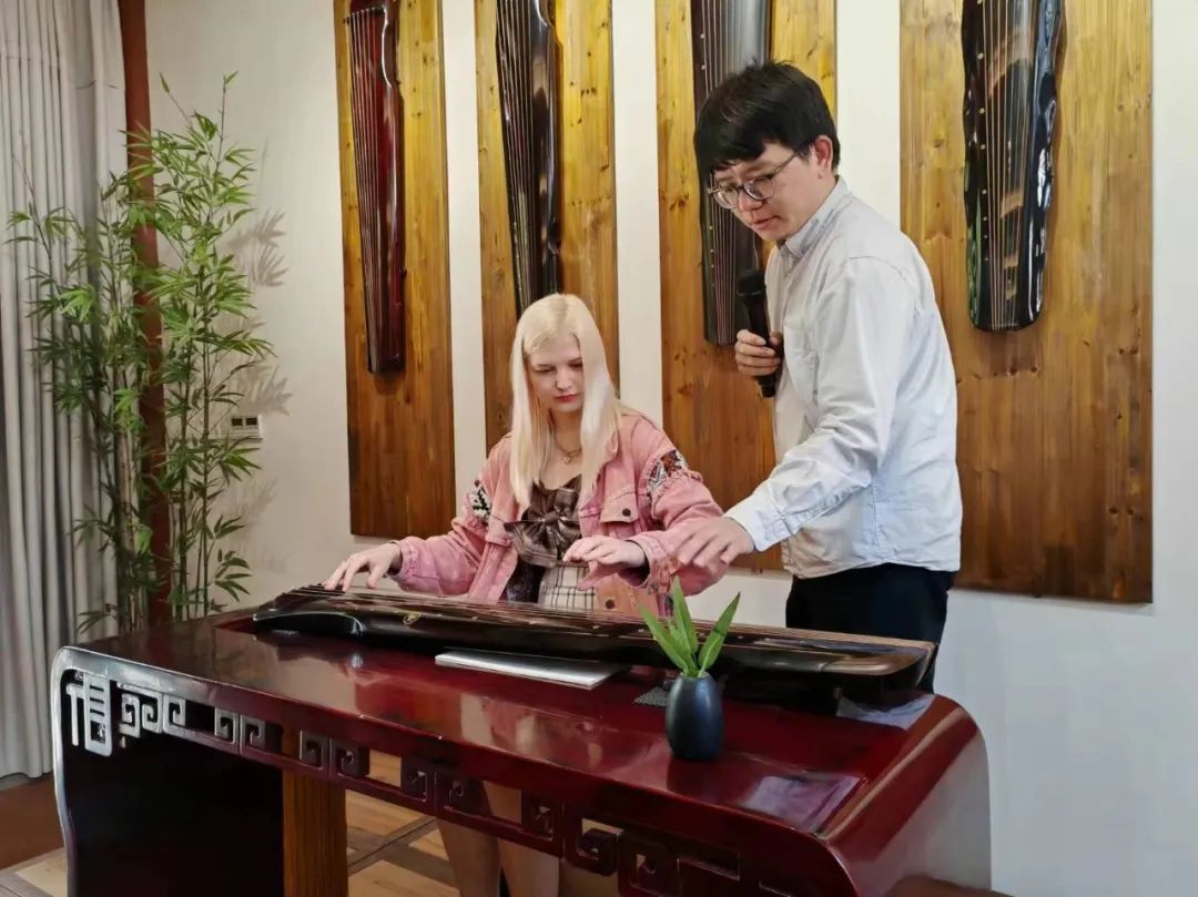 在古琴文化村,师生们在龙人书院了解了古琴的历史文化,悠扬的琴声仿佛穿越千年,七弦泠泠,大家沉醉于古琴艺术的独特魅力中。随后,在古琴艺术家的带领下,同学们学习减字谱、练习指法,体验了古琴弹奏《登鹳雀楼》。最后,师生一行还参观了古琴制作工坊,了解了如何斫琴,即如何制作一张古琴。选材、设计、绘图、砍削、雕刻、上漆、调音等等,斫琴的过程极为复杂,需经过多道工序,每一张琴都凝聚着匠人的心血与智慧。