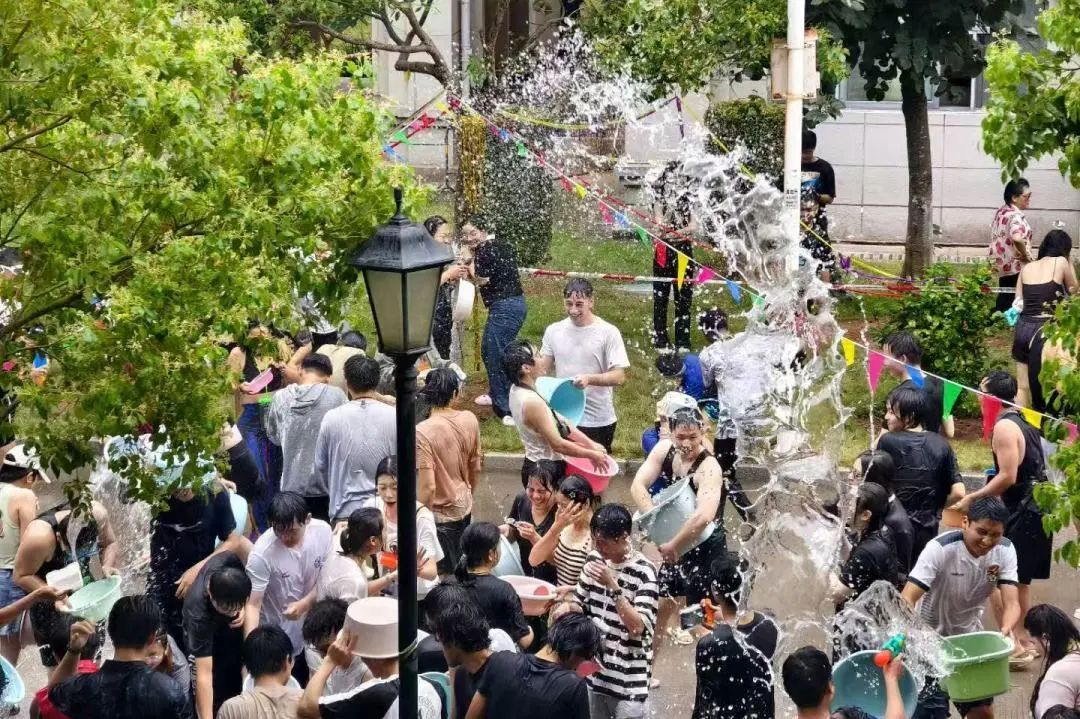 欢腾的鼓点骤然响起,泼水大战在期待中引爆全场。师生们手持水枪、水盆等工具,在漫天水花中尽情释放热情。晶莹水珠在阳光下碎成星子,织就一张跃动的光网。来自各个国家的学子以水为媒,泼洒祝福,欢声笑语与水珠飞溅的节奏相映成趣。随着泼水环节渐近尾声,意犹未尽的同学们跟随音乐欢呼,舞蹈,享受着泼水节带给大家的欢乐。