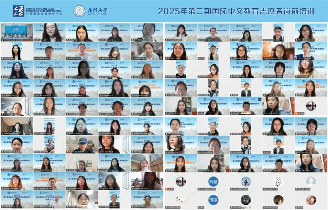 5月6日上午,厦门大学2025年第三期国际中文教育志愿者岗前培训开班仪式通过线上平台顺利举行。厦门大学国际中文教育学院/海外教育学院副院长潘超青、培训授课教师代表、班主任代表、83位国际中文志愿者储备人员参加开班仪式。仪式由国际中文教育学院/海外教育学院语合中心副主任林琳主持。