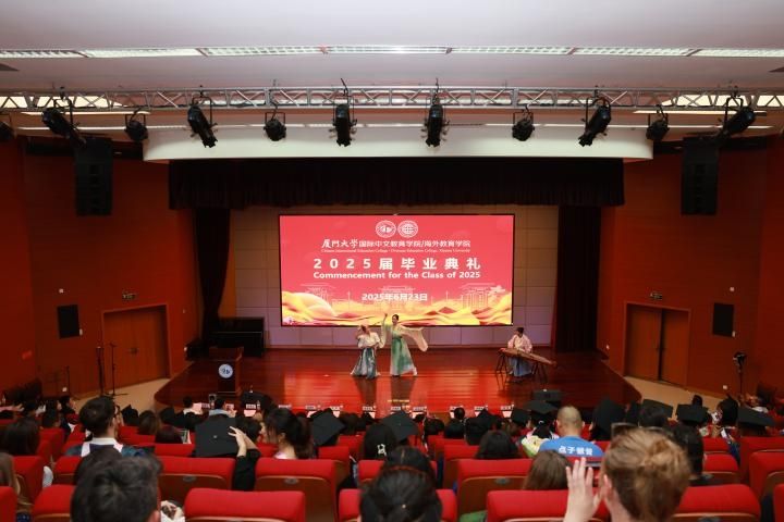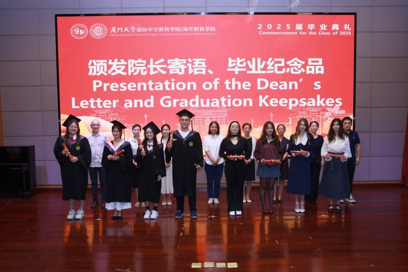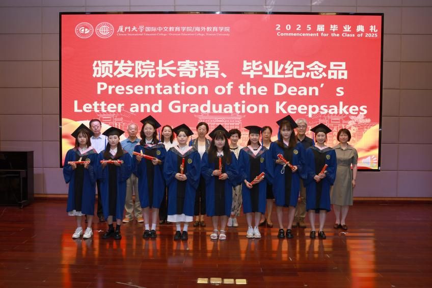 典礼在庄严的国歌声中开幕。陈志伟首先致辞。她代表全院师生员工,向97名毕业生,165名汉语进修结业生、交流生致以最热烈的祝贺! 她以“跨越三重桥梁的旅程”回顾同学们的厦园之旅:“跨海之桥”,大家从五湖四海来到厦大,在不同文化初次相遇的地方播下希望;互鉴之桥”,同学们在校园里跨越文化隔阂,在知识与文明的交融里汲取成长的力量;“传道之桥”,毕业生要从中国走向世界,在文明互鉴中传递光亮。她勉励毕业生积极践行“自强不息,止于至善”的校训,以语言为舟,以文化为帆,在时代的浪潮中勇立潮头,继续搭建跨越国界、连接心灵的桥梁,让中文成为文明对话的通用语言,为构建人类命运共同体贡献力量。
