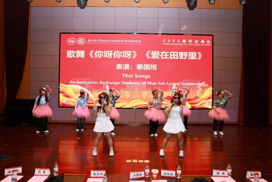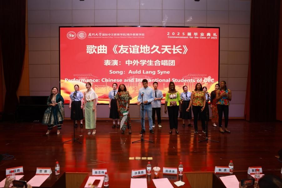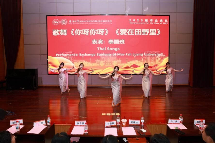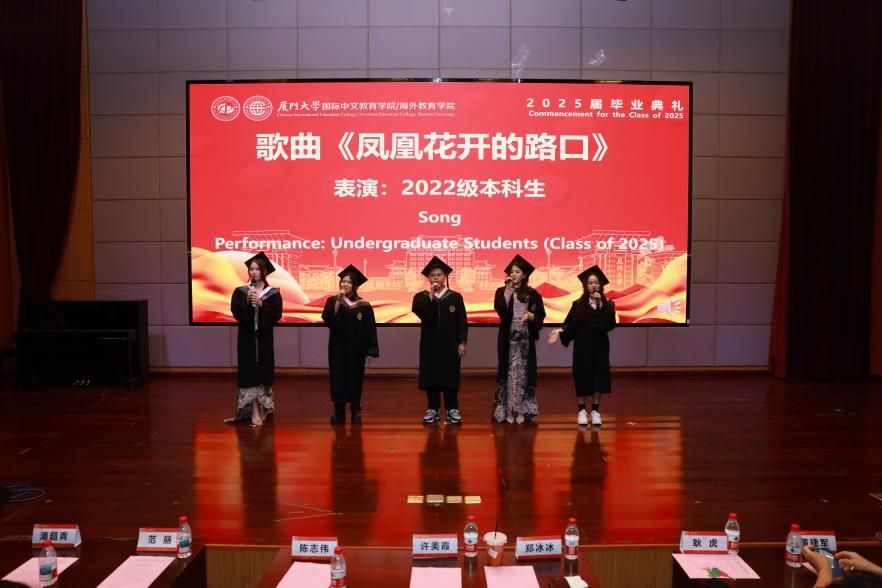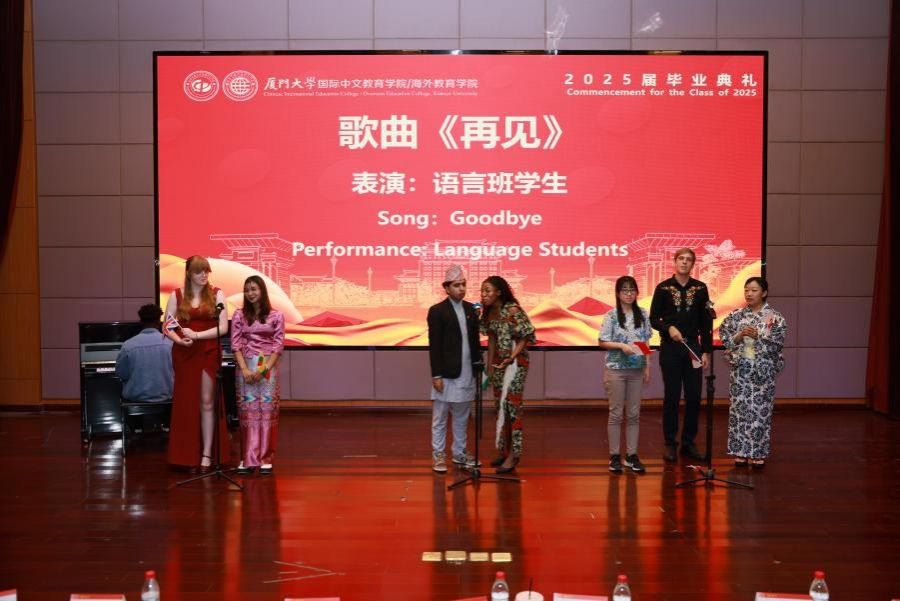 随后,毕业班成果展示精彩呈现。2022级本科生带来的歌曲《凤凰花开的路口》,熟悉的旋律,火红的青春让人无限感慨;2023级硕士研究生朗诵的《心之所向,无问西东》,感受语言与文化的交融,让我们跨越山海,绽放瀚宇之花;泰国班表演的歌舞《你呀你呀》《爱在田野里》,异域风情、活力四射;语言生班带来歌曲《再见》,“这些厦园日子在我心中永远都不会抹去”;中外学生合唱《友谊地久天长》,愿各国同学友谊长存,地久天长。