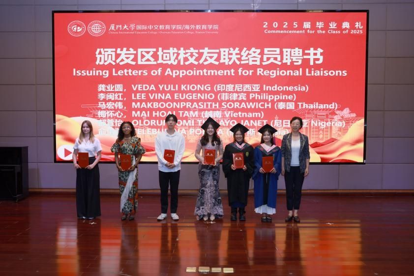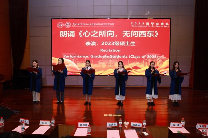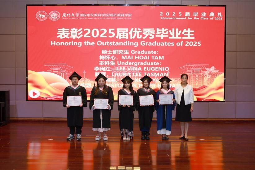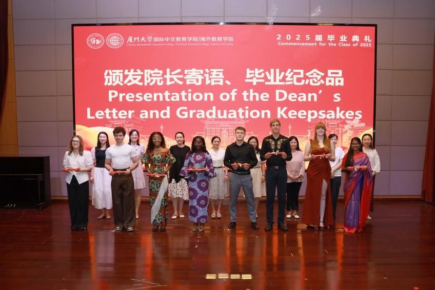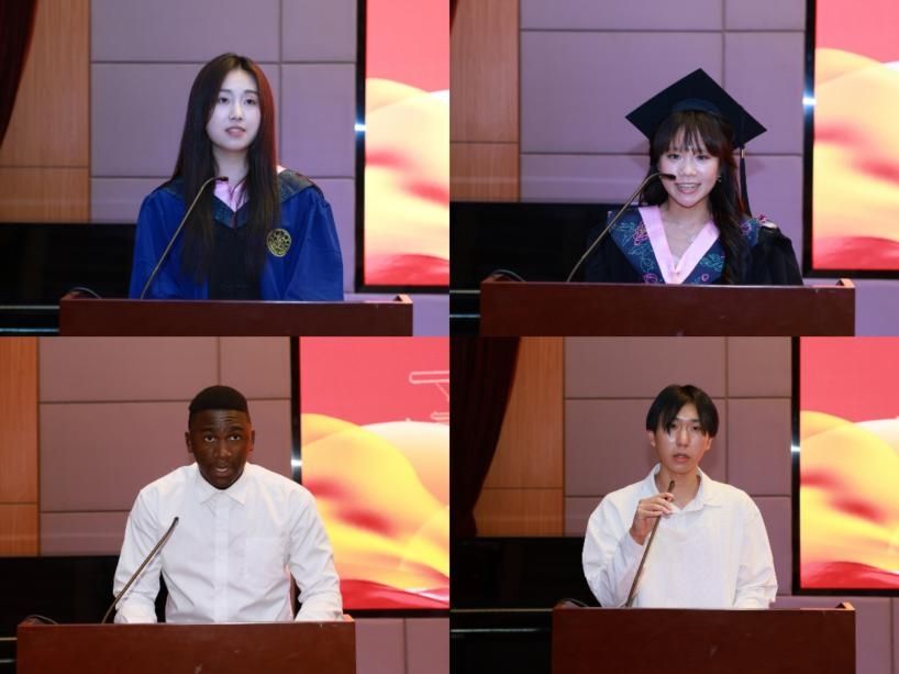 2022级硕士生尹雨桐、2022级印尼籍本科生陈薇 、泰国籍高级进修生纪乃元博士、喀麦隆籍语言生王尔德、泰国交流生马宏伟分别代表2025届毕业生和语言进修生发言,分享了自己在厦门大学学习期间的成长与收获,表达了对学院、老师和同学们的感谢,以及对未来的憧憬和信心。