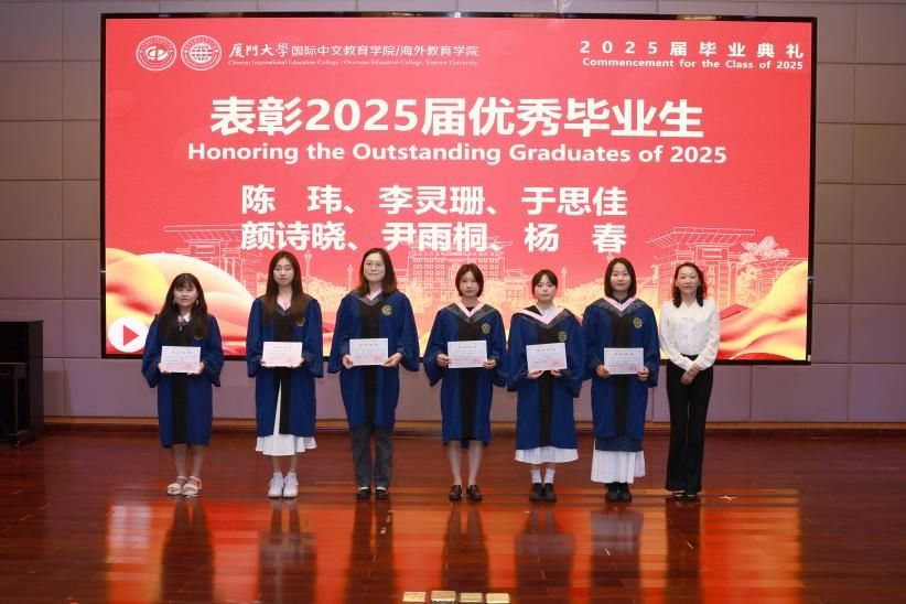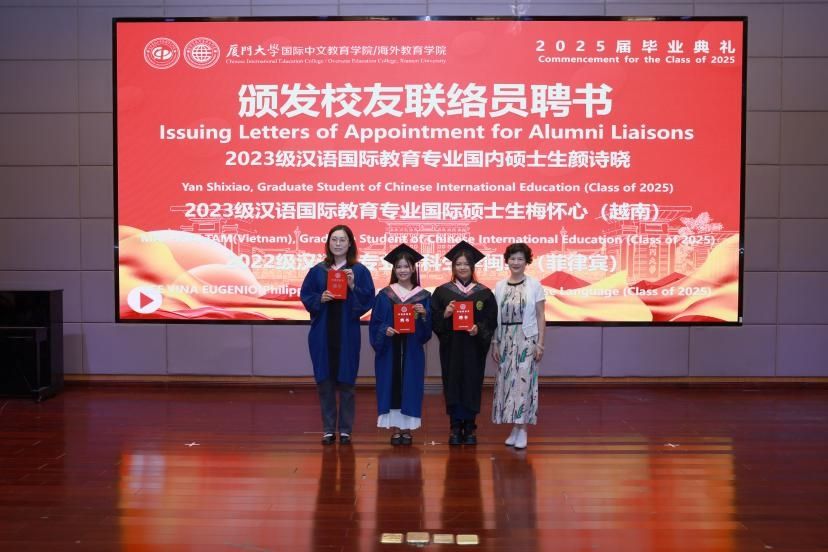 林明华宣读2025届优秀毕业生名单。许美霞、陈志伟分别为中外优秀毕业生颁发证书并合影留念。