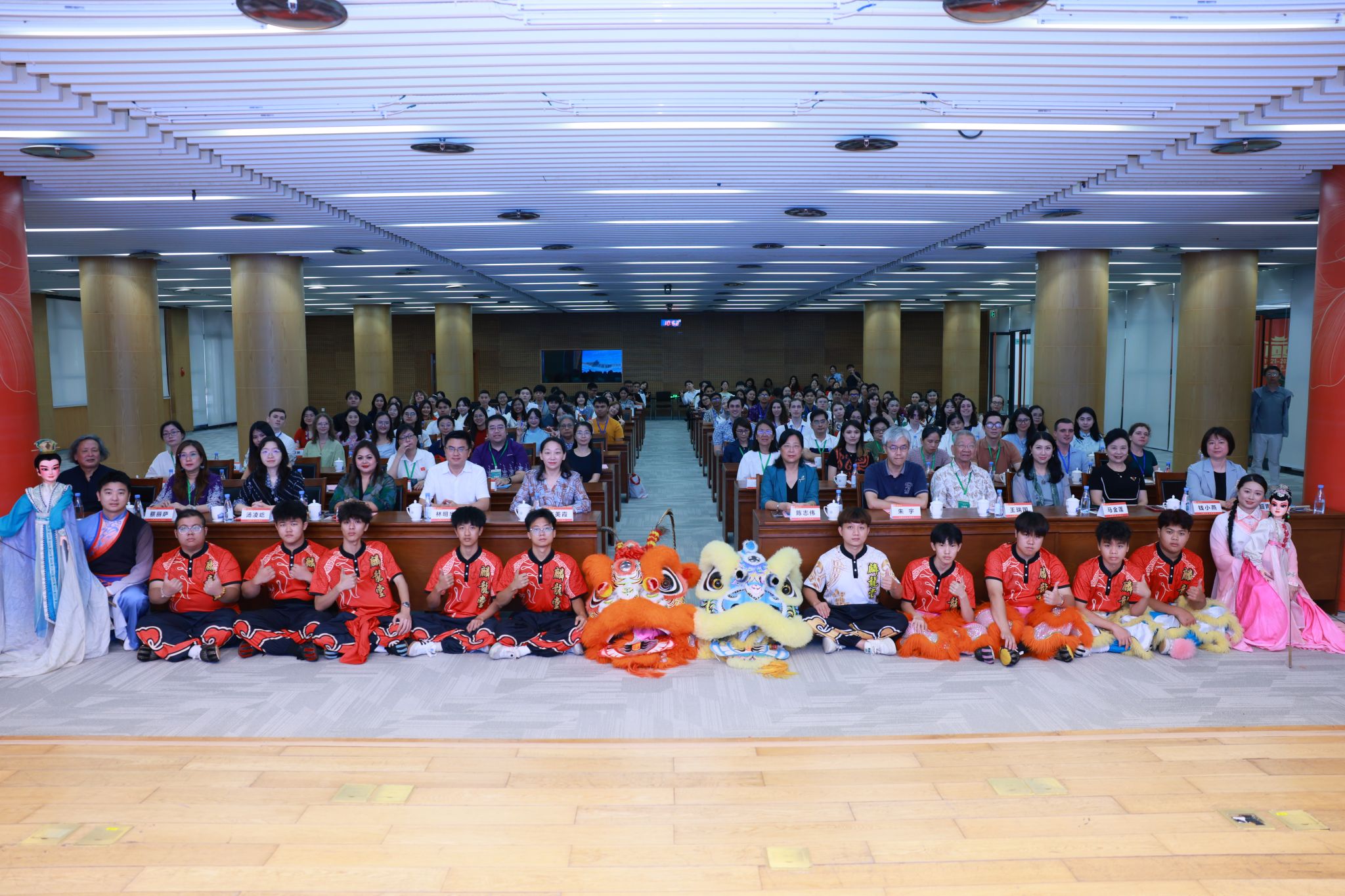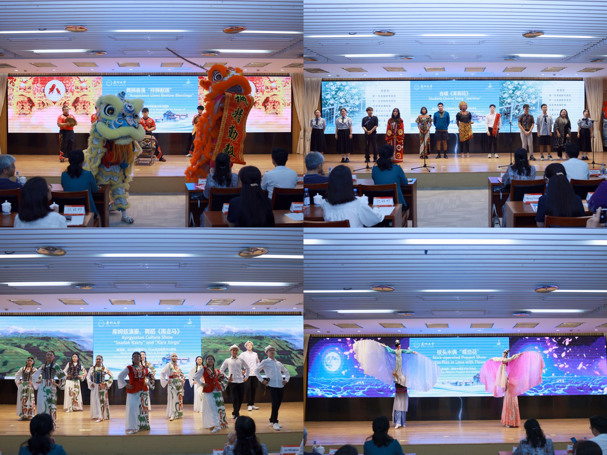 开营仪式以“海丝文韵风采秀”精彩启幕。龙狮团带来的《祥狮献瑞》表演中,祥狮伴随铿锵锣鼓灵动跳跃,以传统民俗寓意吉祥如意,瞬间点燃现场氛围;中外学生合唱的经典民歌《茉莉花》,用悠扬旋律传递中华文化的温婉雅致;吉尔吉斯斯坦 Fly High 语言教育中心师生带来的传统乐器演奏与“黑走马”舞蹈,展现出海丝沿线国家独特的艺术风情;闽南木偶艺术传习中心带来的杖头木偶表演《蝶恋花》,以细腻的操作技艺演绎传统艺术的精妙,令中外营员沉浸式感受不同文化的交融之美。