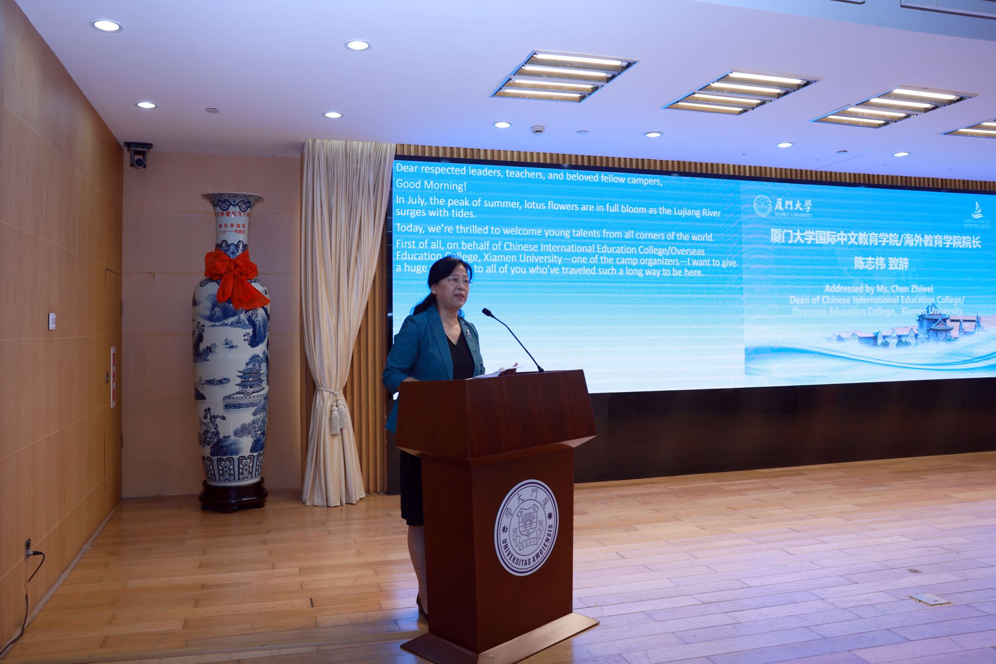 陈志伟在致欢迎辞中提到,厦门作为承载海丝文明基因的城市,孕育了以“自强不息,止于至善”为精神内核的厦门大学,其历经百年发展已成为中外文明交流的重要枢纽。学院以推动文化交流为使命,本次夏令营精心设计学术探索、文化体验与跨文化交流三大板块活动,期待营员们成为中外友谊的传播使者。