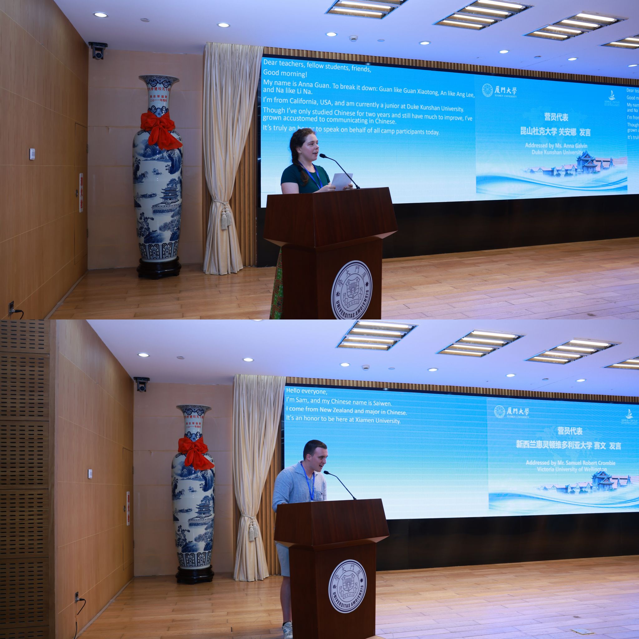 来自昆山杜克大学的关安娜与新西兰惠灵顿维多利亚大学的赛文作为营员代表先后发言。关安娜呼吁营员以开放胸襟倾听中国故事,用中文搭建文明桥梁;赛文则期待在文化体验中感受真实中国,与各国伙伴缔结深厚友谊。