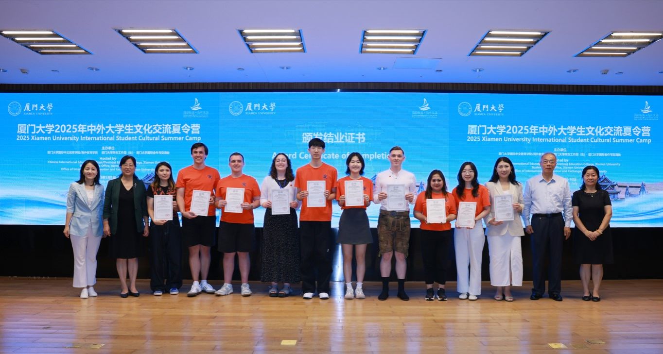 7月10日,洋溢着欢声笑语与依依惜别的氛围,“鼓浪听涛·海丝文韵”2025年中外大学生文化交流夏令营在厦门大学思明校区圆满落下帷幕。厦门大学国际中文教育学院/海外教育学院院长陈志伟,国际合作与交流处副处长刘婉玉,国际中文教育学院/海外教育学院华文系副系主任郭建花,原副院长、学院招生科负责人黄建军,印尼巴厘省教育、青年和体育局 Komang Happy Mayundari(高蔓·哈比·马芸达莉),中国驻登巴萨总领事馆汤凌屹,吉尔吉斯斯坦FLY HIGH语言教育中心马金莲、恩熙以及来自全球20个国家39所院校的104名学员与厦大师生齐聚一堂,通过视频回顾、致辞分享、证书颁发和文艺汇演等形式,为为期10天的文化交融之旅画上温情句点。