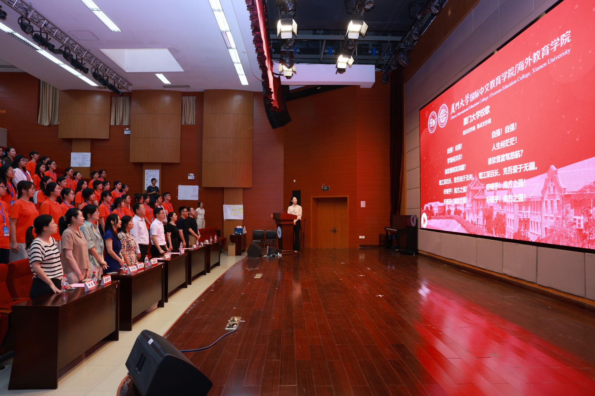 7月9日上午,开营仪式在翔安校区坤銮楼B102报告厅举行。厦门大学国际中文教育学院/海外教育学院院长陈志伟,党委副书记林明华,副院长耿虎、副院长潘超青,华文系系主任朱宇,副主任孟繁杰、郭建花等出席,学院研究生导师代表、学院语合中心、团委负责人及教学管理人员参加活动,仪式由耿虎主持。