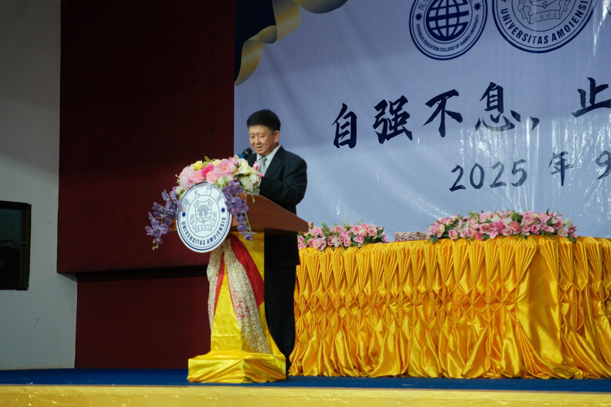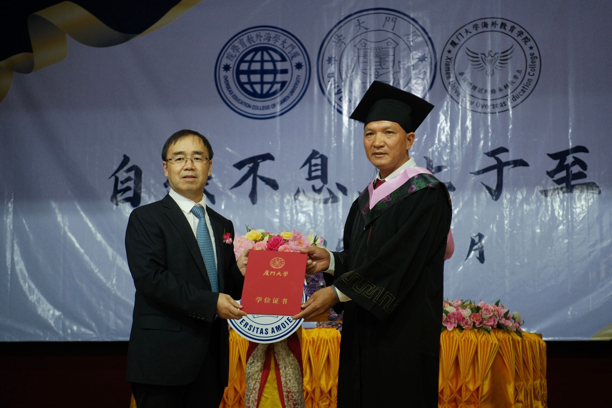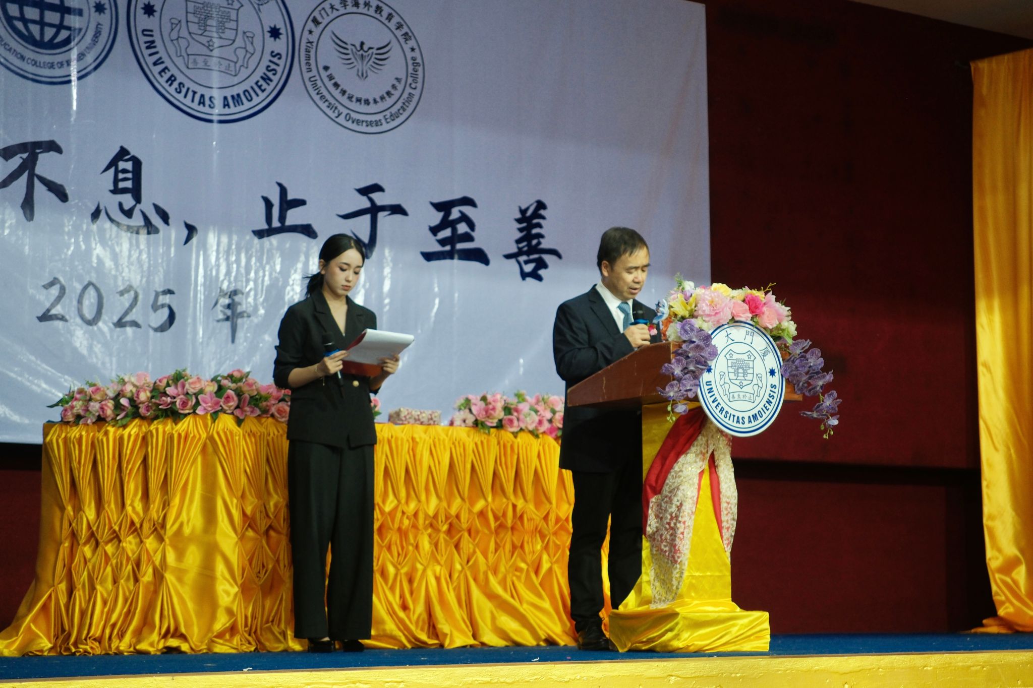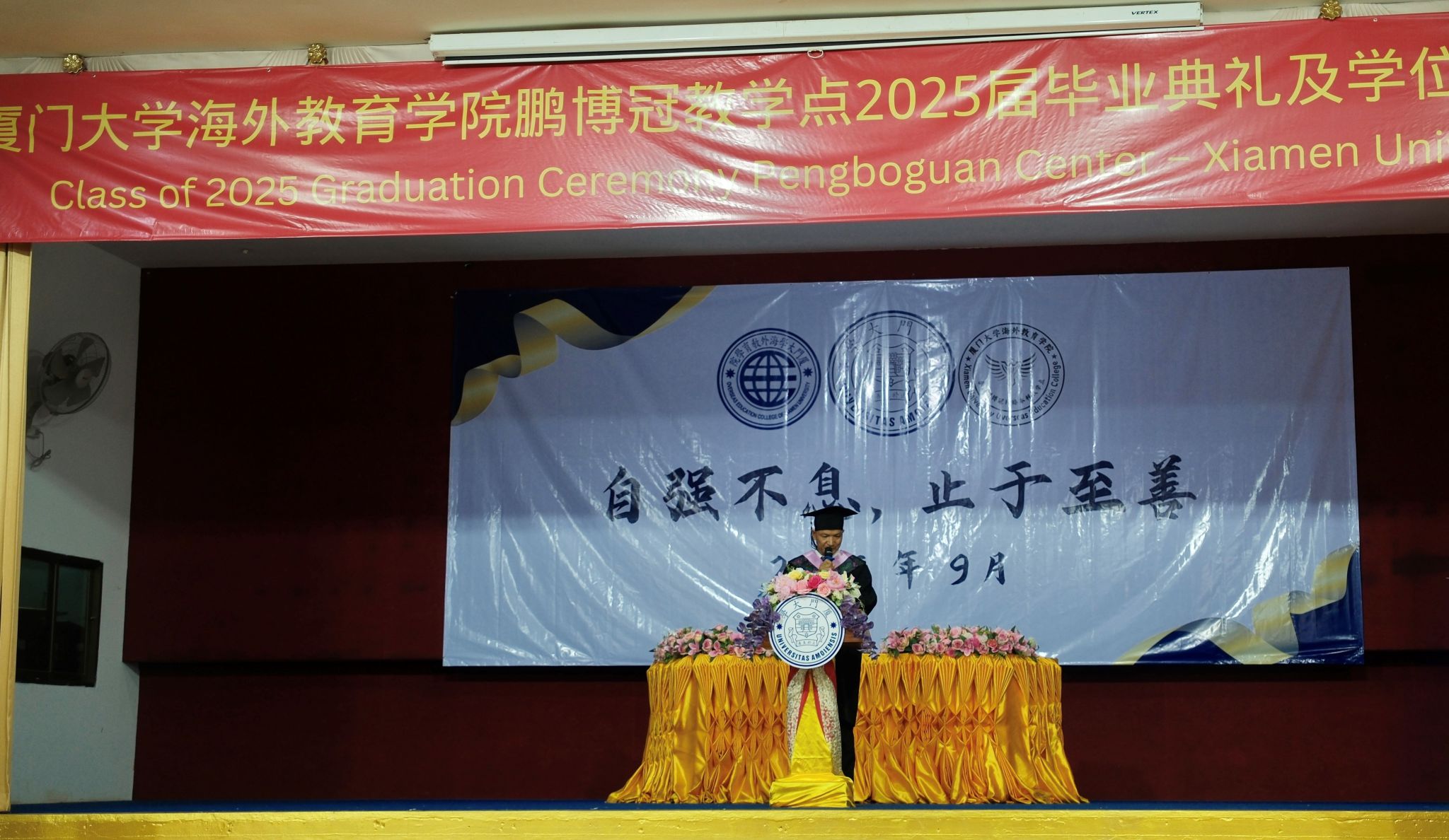 毕业生代表田景燦分享了自己扎根泰缅边区从事华文教育三十余年的经历,他呼吁全体毕业生秉持厦门大学“自强不息,止于至善”的校训,心怀感恩,以服务华文教育的坚定决心继续前行。
