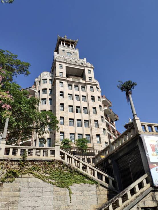 肖老师首先带领大家参观了嘉庚建筑。嘉庚建筑指的是著名的爱国华侨领袖陈嘉庚于20世纪上半叶亲自规划、设计和监造,为创办集美学校和厦门大学所建造的近百栋具有中西合璧风格的校舍和公共建筑。陈嘉庚先生旗帜鲜明地表示自己的观点:“一个民族,抹杀自己民族传统建筑形式,而只求模仿洋化的道路,埋没自己民族建筑的文化建筑技术,是没有国性的,是不应该的。”嘉庚建筑集中了闽南地方建筑特色、中国传统建筑精华和欧亚建筑优点,形成以中式屋顶西式屋身为主要特征的鲜明个性,构成了“穿西装、戴斗笠”的“兼容并蓄”的内涵特征,其主要代表包括:群贤楼,建南楼,芙蓉楼,南薰楼,道南楼,延平楼,尚忠楼。