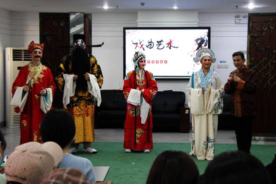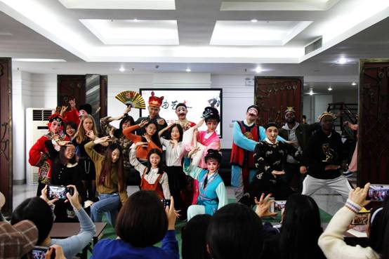 图为同学们体验戏曲装扮(从左到右:英国王劭侯、墨西哥荷马、阿富汗史菲琪、中国刘敏)