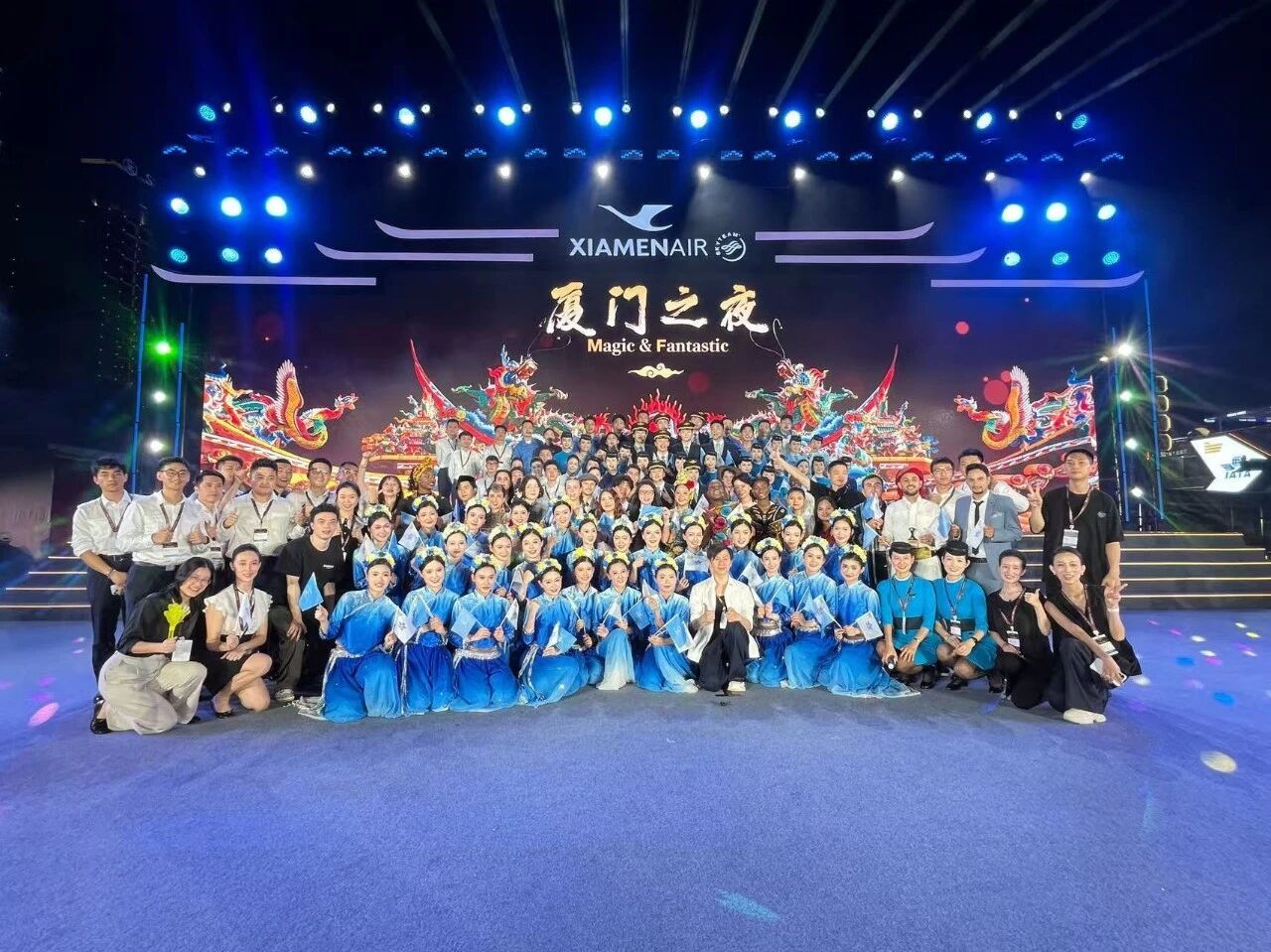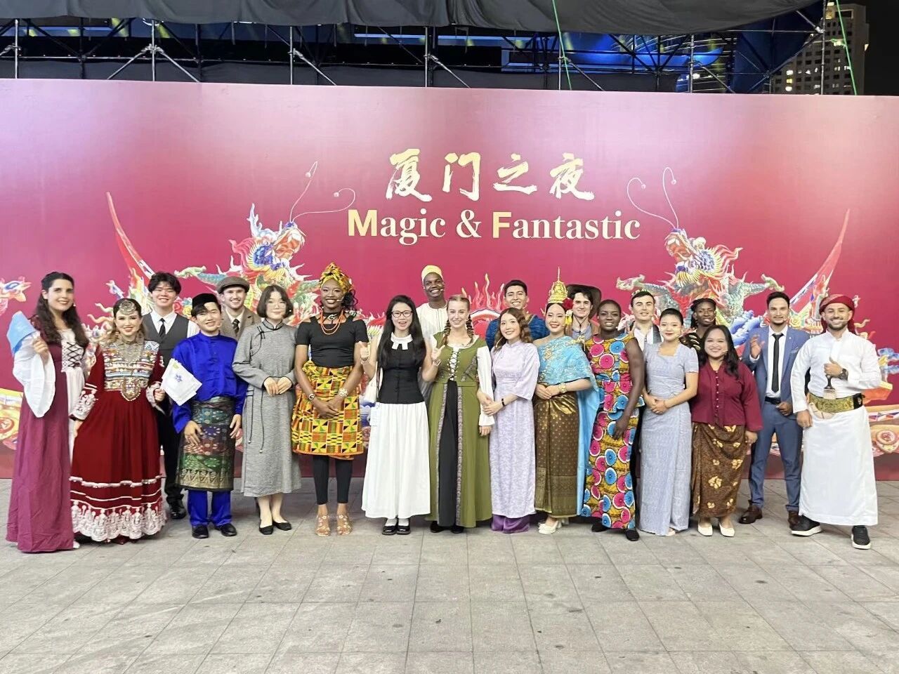 10月15日晚,厦门和平码头流光溢彩,由厦门航空承办的国际航协2025 年世界安全与运行大会(WSOC)配套晚会“厦门之夜”盛大启幕。学院组织20名国际学生亮相晚会压轴大型歌舞节目《天和・鹭舞中华》,国际生们身着本国传统服饰,以中英双语演唱《友谊地久天长》,以艺术为纽带传递跨国情谊,成为当晚极具感染力的文化交流亮点。