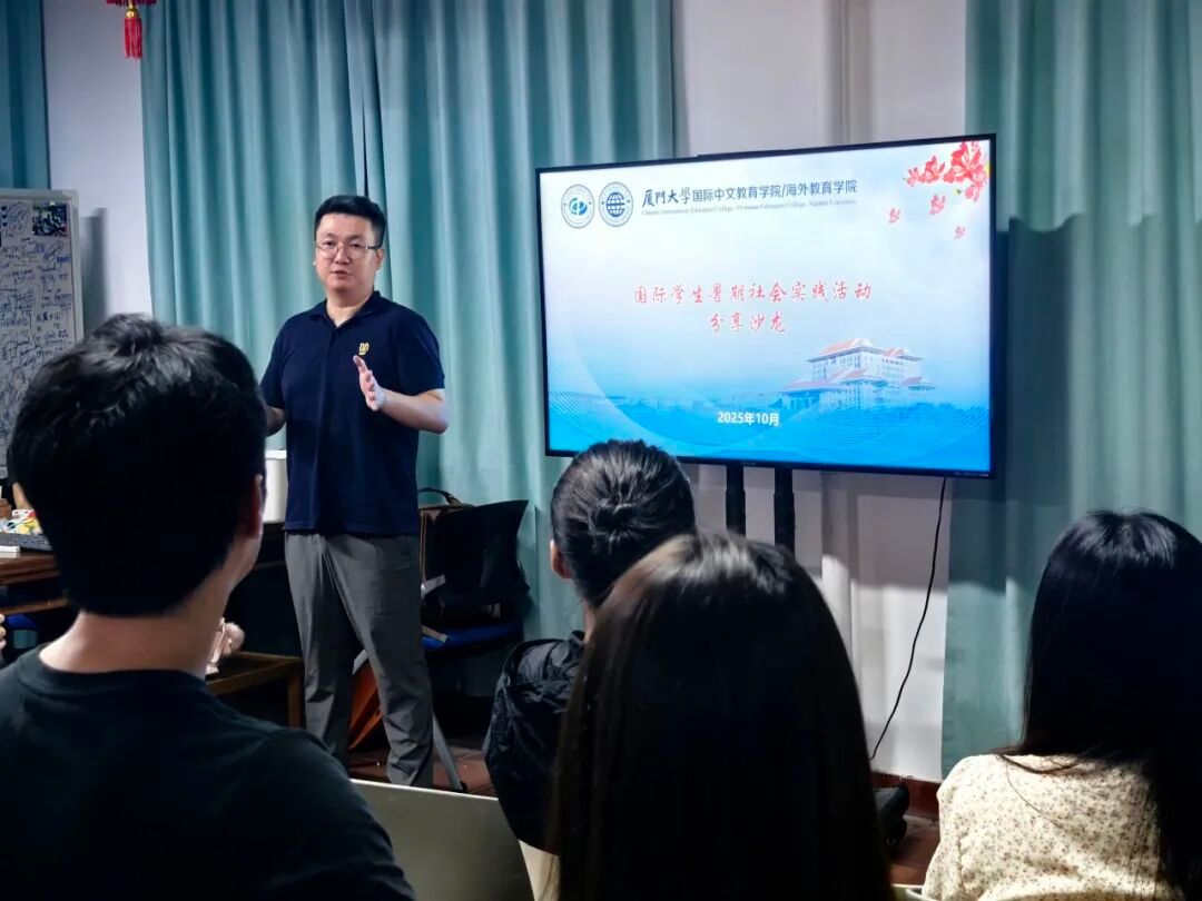 活动伊始,实践队负责老师林炯详细介绍了此次暑期社会实践的总体目标、队伍组成、选拔流程及行程路线,为分享会拉开序幕。他特别强调,这类实践活动是学院 “培养跨文化交流使者”的重要载体,鼓励在座国际新生,要扎实学好中文、积极参与校园活动,在提升学业与综合能力的同时,争取获得参与实践、深入探索中国的机会。