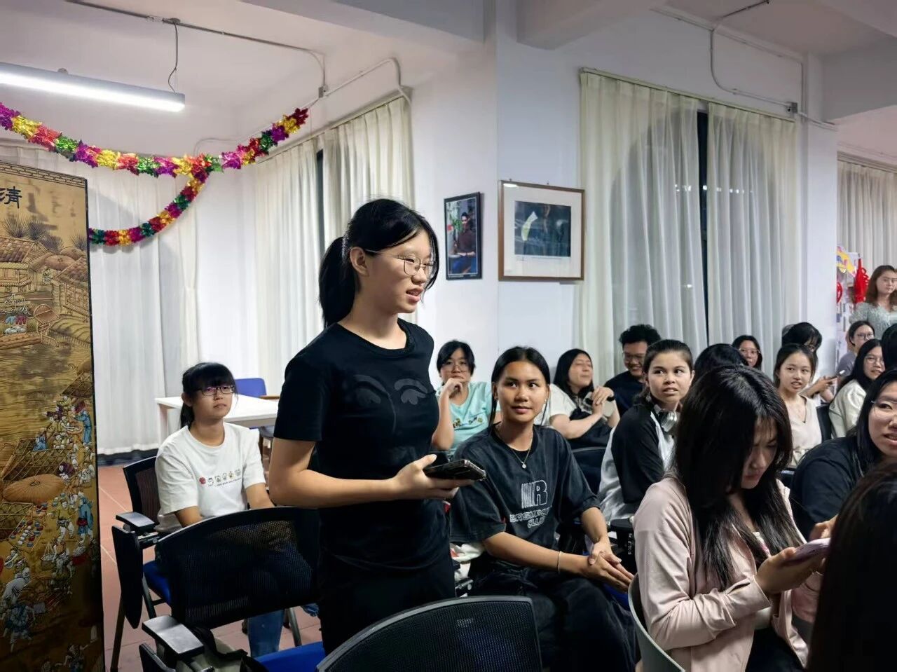 活动压轴的互动问答环节,将现场气氛推向高潮。主持人刚抛出 “你最想去中国哪个城市探索” 的问题,同学们便踊跃发言:有同学向往当地别具一格的城市风格与特色美食;也有同学期待走进少数民族居住的区域,感受独特的民族文化与山水风光。新生们的积极参与,也让现场成为一场小型 “文化期待交流会”,为他们未来探索中国埋下伏笔。
