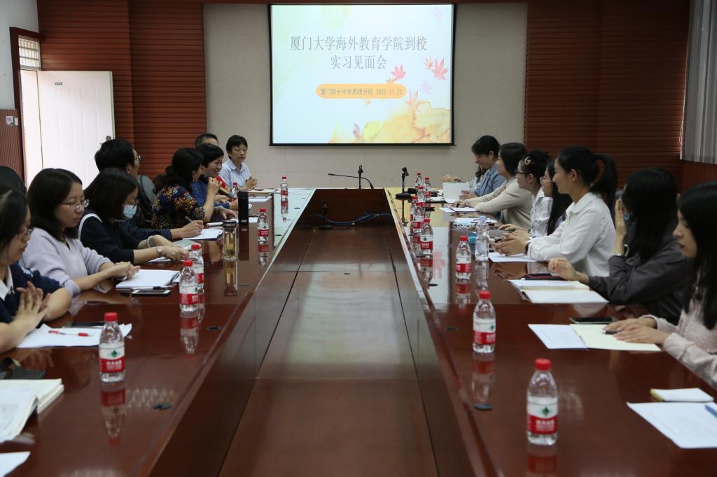 随着全球疫情形势不断升级,汉语国际教育专业研究生前往海外开展实习实践的工作受到很大影响,为了切实解决学生实习的困难,学院积极探索新渠道,经过多方协商、沟通联动,11月23日,我院组织首批8位研究生前往厦门双十中学思明分校开展实习工作,学院党委副书记吴荻、华文系(主持工作)副主任潘超青、带队老师张桃、颜彩蓉与实习成员参加了实习启动仪式暨导师见面会。