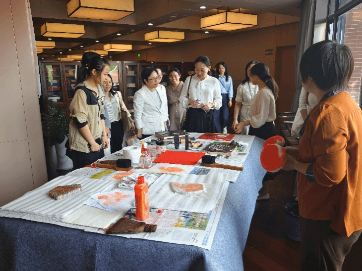 师生党员依次参观了少儿分级阅读区、多功能报告厅、影音体验室等,深入了解新城馆区在智能化文献借阅、信息检索等方面提供的先进便民服务,切身感受到科技赋能如何为文化传播插上效率与创新的翅膀,为未来创新国际中文教学手段提供了重要启示。而在古籍文献馆亲手体验拓印技艺的环节,则是一次从“知”到“行”的升华。洒水叠纸、研墨上色、小心取纸,大家在动手实践中感受非遗工艺的独特魅力。这不仅是对非物质文化遗产的深度体验,更让同学们探索出“传统技艺+现代教学”的融合路径,为未来将非遗元素融入国际中文课堂、推动中华文化创新传播积累了实践经验。