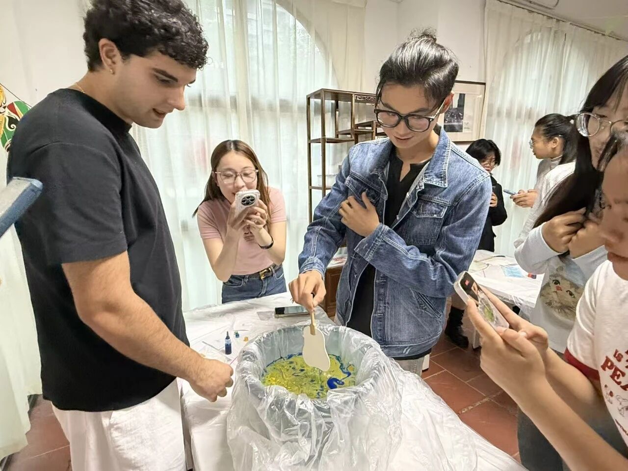 随后的实践环节中,同学们在指导下逐步尝试漂漆、点染、勾勒等关键工序。现场气氛温馨热烈,大家或凝神创作,或交流心得,将现代审美与个人创意融入素白扇面。经过一个多小时的精心制作,一幅幅色彩纷呈、构图别致的漆扇作品陆续完成。