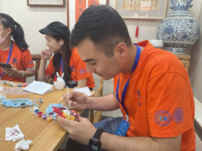 中国工艺美术馆内,青铜编钟、青瓷莲花尊展现传统工艺的精湛底蕴,让队员们感受到了非遗的独特魅力;琉璃厂文化街,队员们动手为非遗“兔儿爷”着色,各国多元文化在创作中和谐交融;浙江省非物质文化遗产博物馆里,“十里红妆”等地域展品独具特色,队员们为西湖绸伞着色,感受传统工艺之美,表达对非遗文化的敬意。
