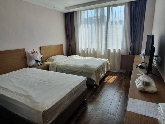 隔离第一天,隔离区的老师为我送来一箱饮料;由于餐饮不适应,隔离前几天一直没有点餐,隔离区的老师担心我,还特意过来关心我,我在隔离房间里吃从韩国带来的零食和简餐。