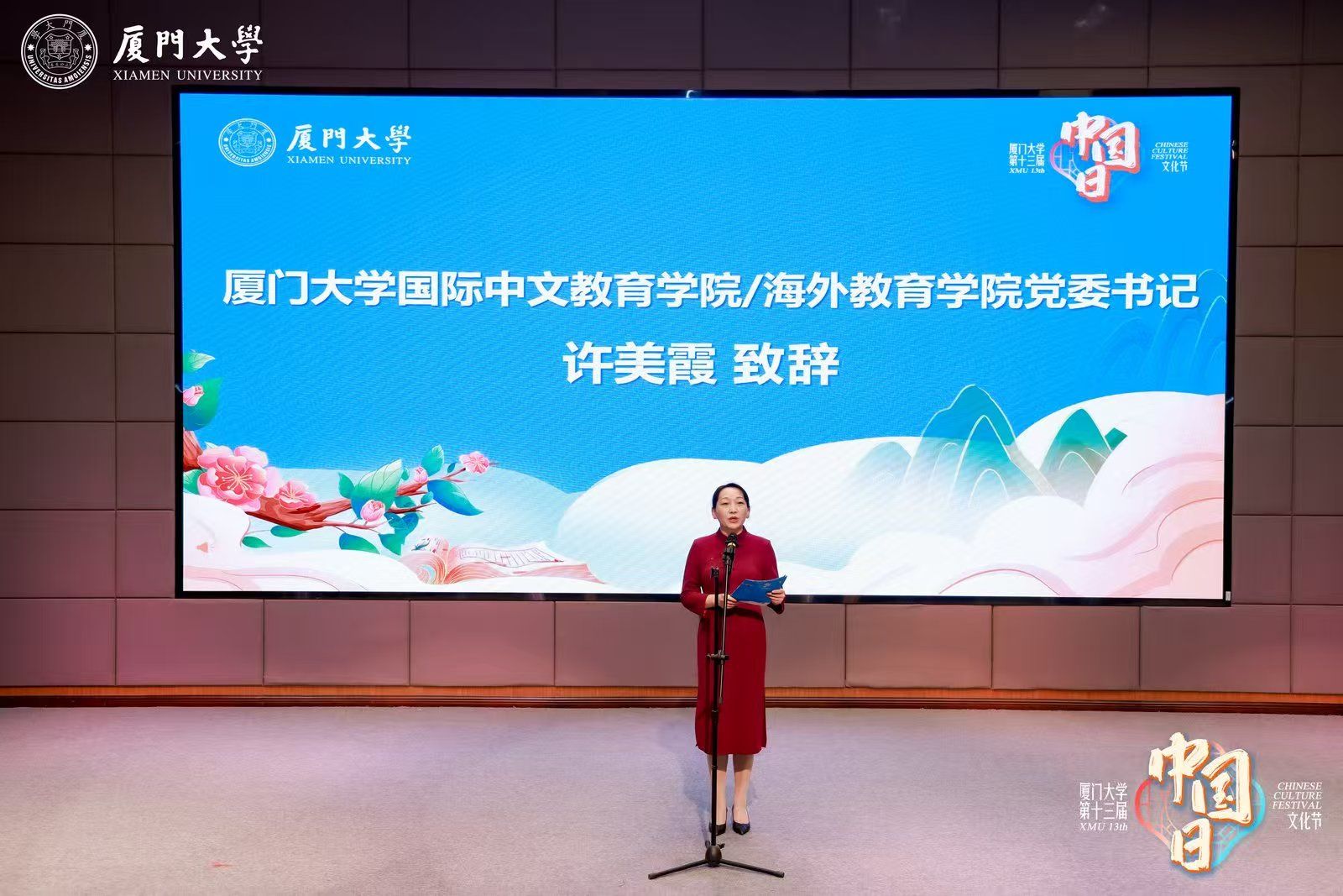 厦门大学国际中文教育学院/海外教育学院党委书记许美霞致辞。她指出,习近平总书记强调“语言是人类交流思想的工具、传承文明的载体、增进理解的桥梁”,“中国日”文化节立足“传承文明、联通世界”初心,通过丰富多彩的文化活动,开展多维度深度融合,成为世界文化交融的“大舞台”。本次活动也与2025年世界中文大会“创新引领 数智赋能——让中文零距离”的主题相契合。学院将赓续初心,以更高站位、更宽视野深耕这一文化品牌,让世界各地的朋友们与中文、中华文化真正的“零距离”,在新时代书写文明交流互鉴的崭新篇章。