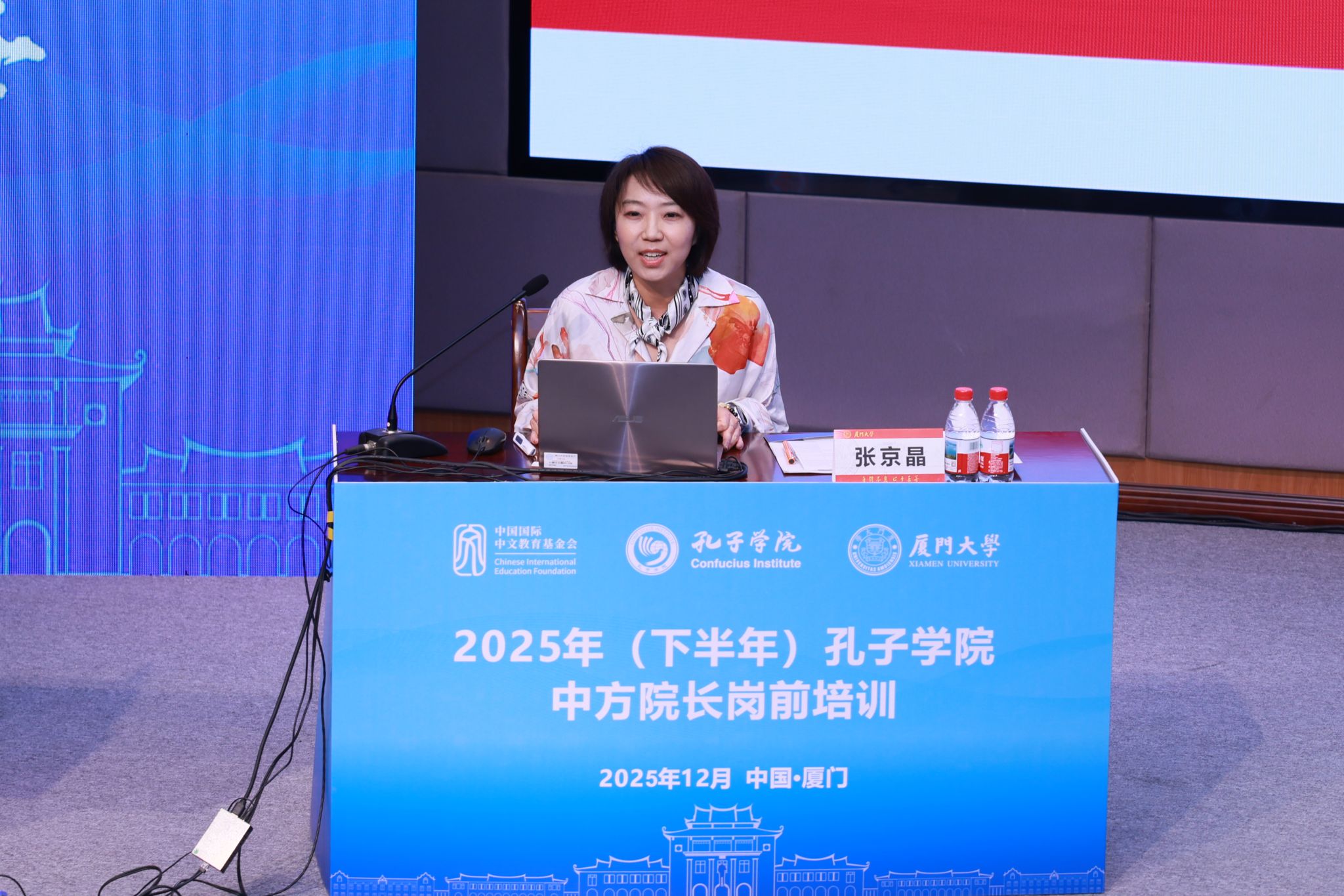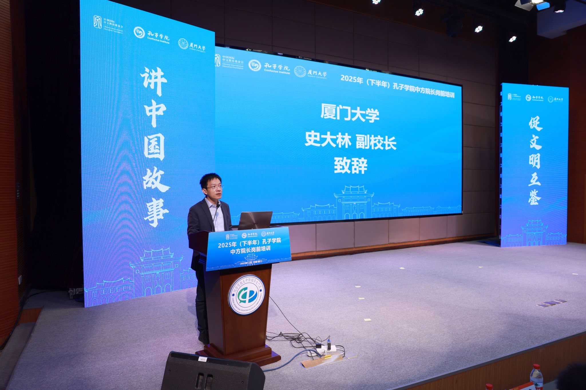 12月1日上午,由中国国际中文教育基金会主办、厦门大学承办的2025年(下半年)孔子学院中方院长岗前培训开班仪式在我校翔安校区坤銮楼B102报告厅隆重举行。中国国际中文教育基金会培训与评估部副主任张京晶出席开班仪式,我校副校长史大林出席并致辞,开班仪式由国际中文教育学院/海外教育学院院长陈志伟主持。